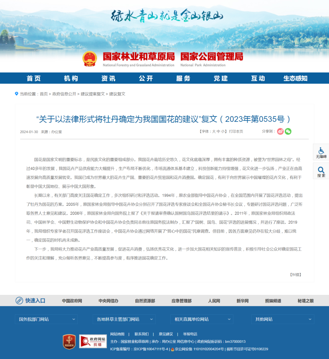 近日,国家林业和草原局官方网站发布“关于以法律形式将牡丹确定为我国国花的建议”复文。全文如下: