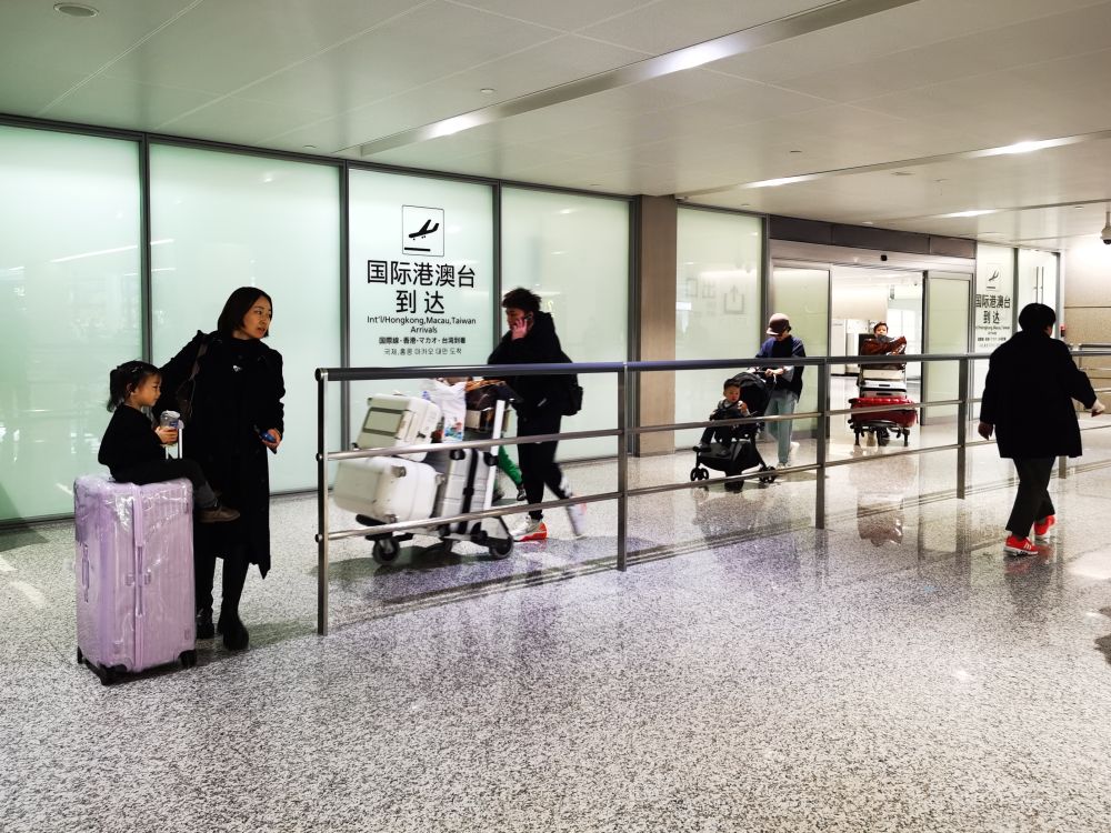 2月14日,游客走出上海虹桥机场国际港澳台到达出口。新华社记者 陈爱平 摄