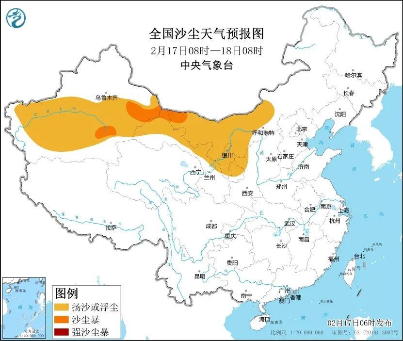 受冷空气大风影响,预计2月17日8时至18日8时,新疆东部和南疆盆地、内蒙古中西部、甘肃北部、宁夏大部、陕西西北部等地的部分地区有扬沙或浮尘天气,新疆东部和南疆盆地东南部、内蒙古西部、甘肃北部等局地有沙尘暴。中央气象台2月17日6时继续发布沙尘暴蓝色预警。