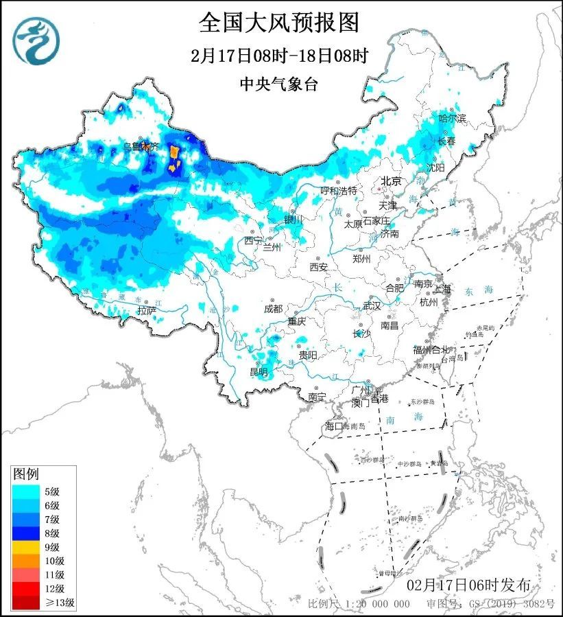 2月17日8时至18日8时,新疆北疆东部和南疆盆地、内蒙古中西部、青海西部、西藏西部、甘肃西部、辽宁西部、吉林西部等地将有5至7级、阵风8至10级的大风,新疆山口地区风力可达12级,阵风13至15级,2月18日8时至19日8时,新疆南疆盆地、内蒙古西部、青海西南部、西藏西部、甘肃西部等地将有5至6级、阵风7至9级的大风;渤海、渤海海峡、黄海大部海域、东海北部海域将有7至8级、阵风9级的大风。中央气象台2月17日6时继续发布大风蓝色预警。