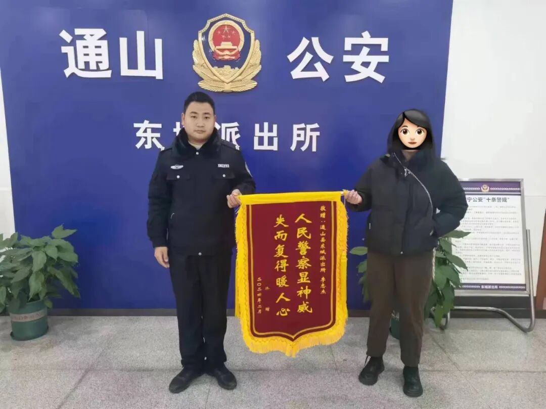 云上通山报道:(通讯员 李志杰)2月20日,南门社区居民徐女士拿着一面“人民警察显神威,失而复得暖民心”的锦旗来到通山县公安局东城派出所,对民警李志杰及辅警胡北海、戴辉杰恪尽职守、为民奉献的工作态度表示衷心的感谢。