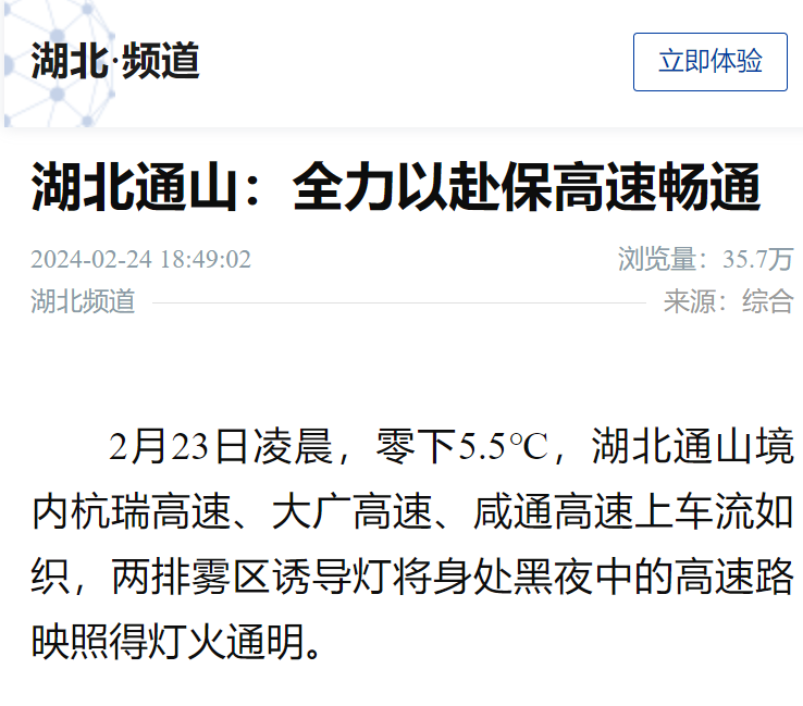 2月25日人民日报客户端湖北频道:《湖北通山:分区作业 彻夜守护 全力以赴保高速畅通》