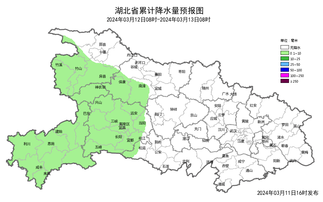 3月12日08时-13日08时,全省晴天到多云,夜间鄂西北南部和鄂西南有短时小雨。最高气温19~23℃,最低气温7~11℃,偏东风3到4级、阵风5到6级。