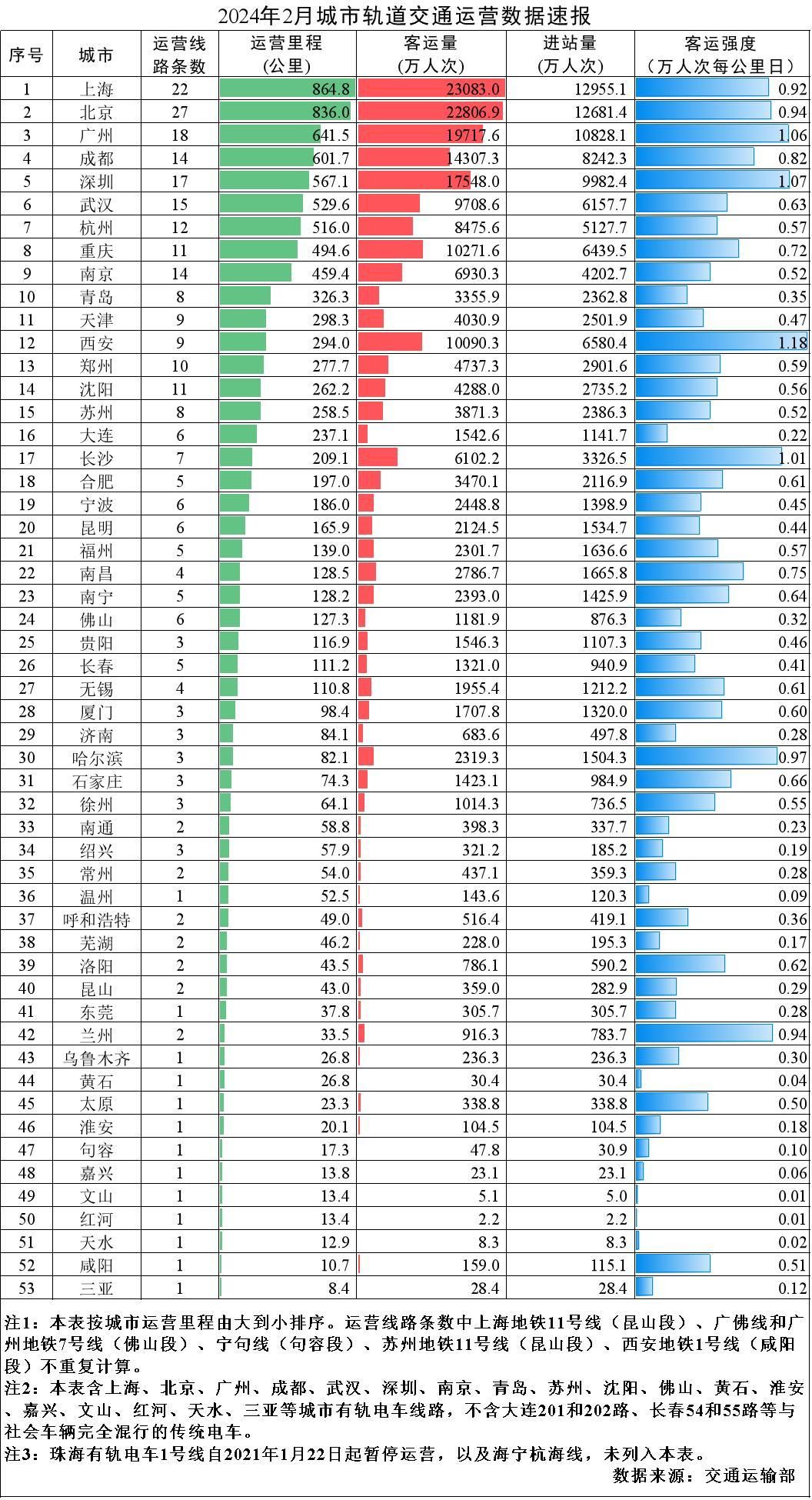 3月12日,据交通运输部消息,2024年2月,31个省(自治区、直辖市)和新疆生产建设兵团共有55个城市开通运营城市轨道交通线路308条,运营里程10205.6公里,实际开行列车317万列次,完成客运量20.5亿人次,进站量12.4亿人次。2月份,客运量环比减少6.1亿人次,降低22.9%,同比减少1.3亿人次,降低6%。2月份全国总运营里程的平均客运强度为0.693万人次每公里日,环比降低17.6%,同比降低14.4%。本月无新开通线路。