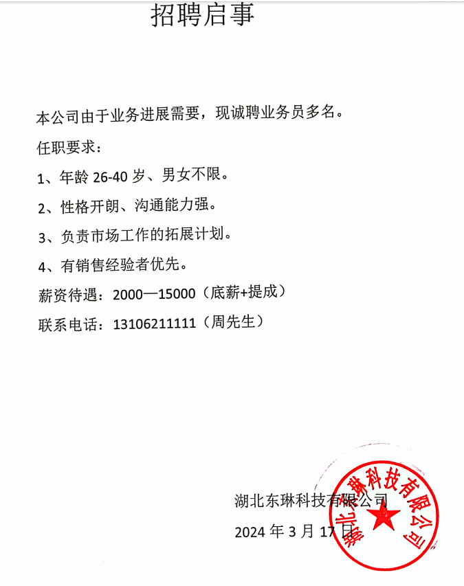 本公司由于业务进展需要,现诚聘业务员多名。任职要求: