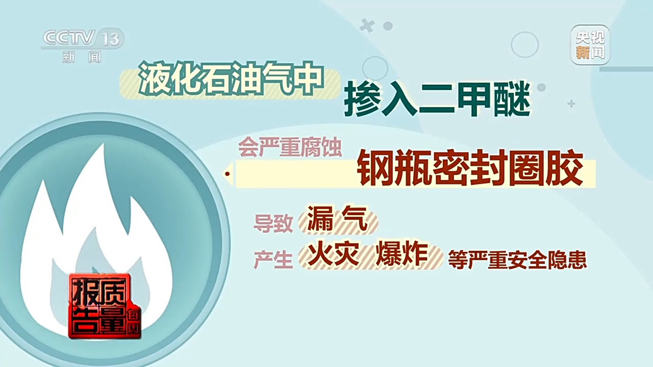 专业人士告诉记者,二甲醚本身为可燃气体,添加到液化石油气里后,普通消费者根本发现不了,即使是市场监管部门,查处起来难度也很大,这是张某敢于铤而走险的另一原因。由于早有应对检查的准备,在接到消费者举报后的第一次查处中,市场监管人员从张某的液化气充装站提取了4个样品,结果检测全都合格。