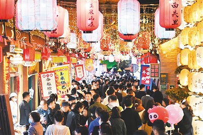 近日,甘肃省天水市的“天水麻辣烫”走红,带动当地餐饮市场持续火热,周边的零售、服务、文旅等消费市场也同步升温。图为游客在位于天水市秦州区的天水古城参观游览、品尝美食。新华社记者 范培珅摄