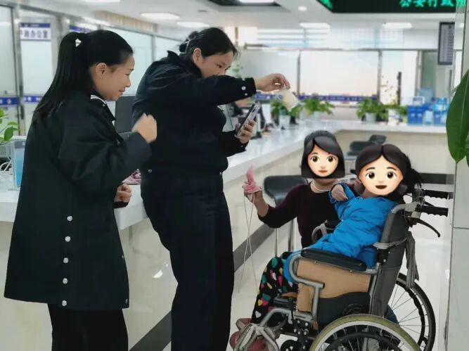 3月底,政务中心公安治安户政窗口,迎来了特殊的一家三口,一对中年男女推着一名坐轮椅的女孩,无助地在大厅徘徊着。“大姐,有什么需要我们帮忙的吗?”户政股工作人员看着她们局促不安的样子,主动上前问候。“孩子不配合,拍照一直不合格,我们好不容易才把孩子带来,如今办不了身份证,都不知道怎么办了!”推着轮椅的女子沮丧的告知着,原来,坐在轮椅上的女孩今年16岁,因自幼身带残疾,且存在智力障碍,所以一直未办理身份证,如今要办理低保等相关证件,夫妻二人便带女儿带来了政务中心,但由于孩子完全不配合,致使办证程序无法进行。