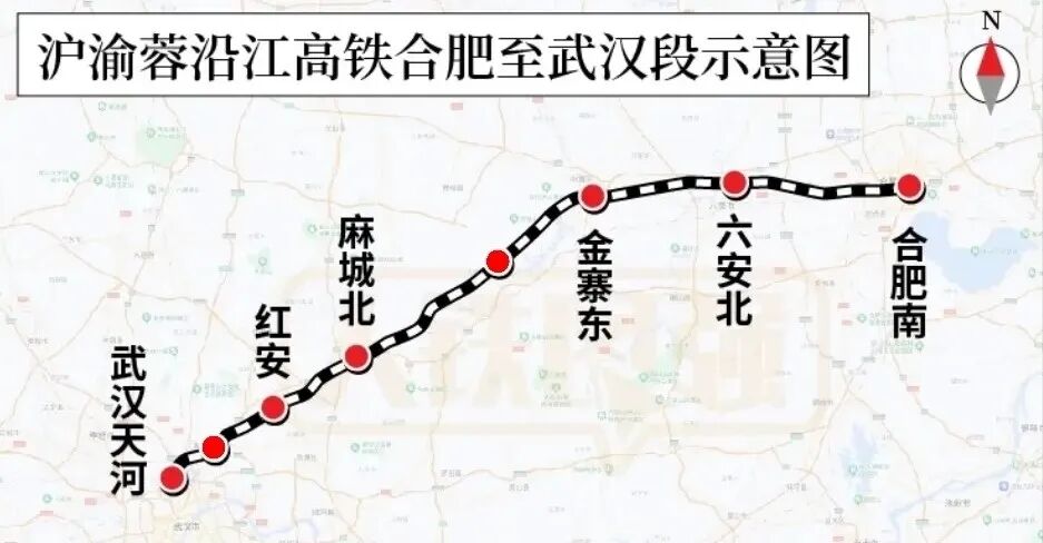 沿江高铁合(肥)武(汉)段位于安徽、湖北省境内,线路起自合肥铁路枢纽合肥南站,经安徽省六安市区及金寨县,湖北省麻城市、红安县至武汉铁路枢纽,经武汉天河站接入在建的沪渝蓉沿江高铁武汉至宜昌段。线路全长约360公里,设计时速350公里,共设合肥南等8座车站。