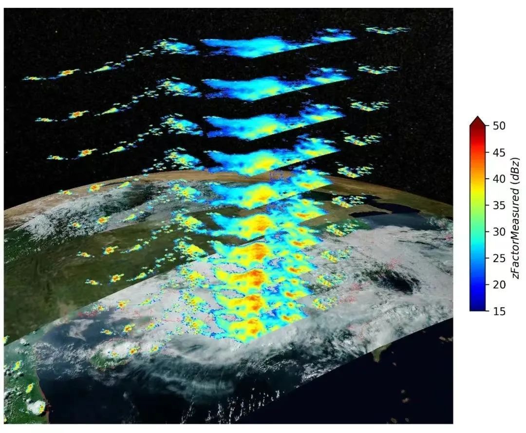 2023年5月7日16时35分,风云三号G星降水测量雷达捕捉到海南与广东阳江附近出现降雨。图中显示的是从地表开始3.75公里到6公里的降水系统三维立体结构。