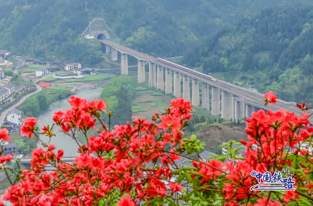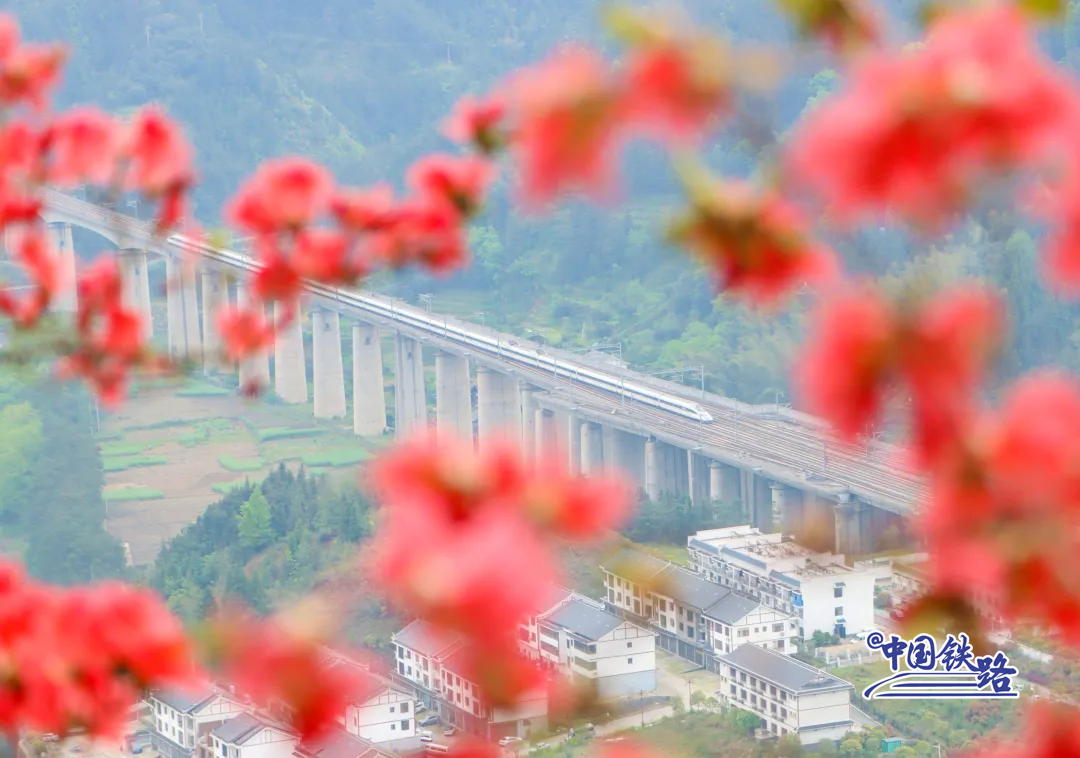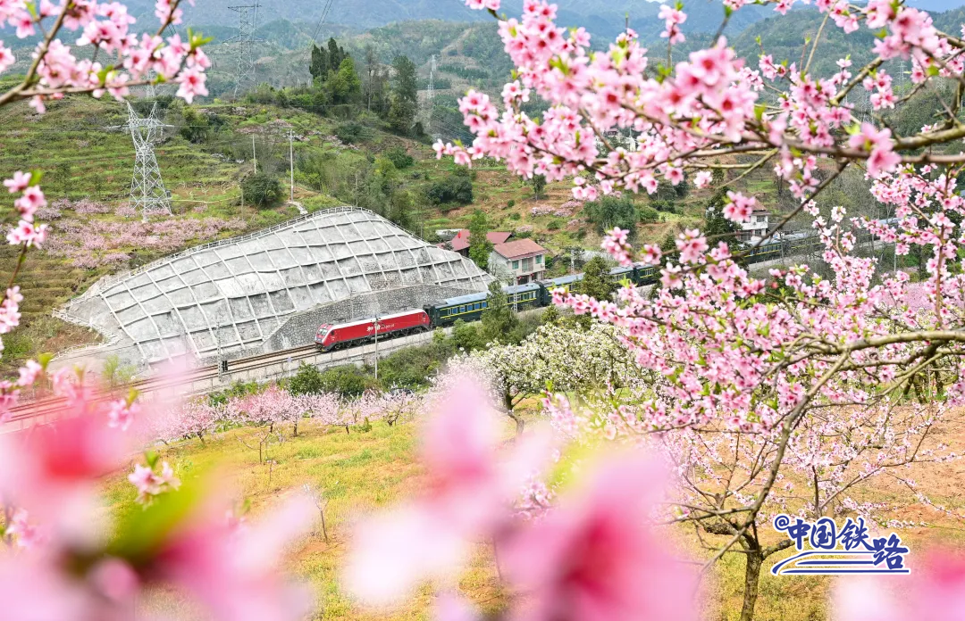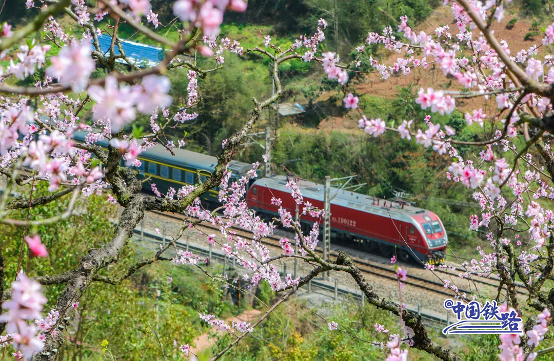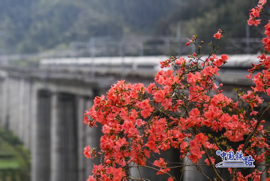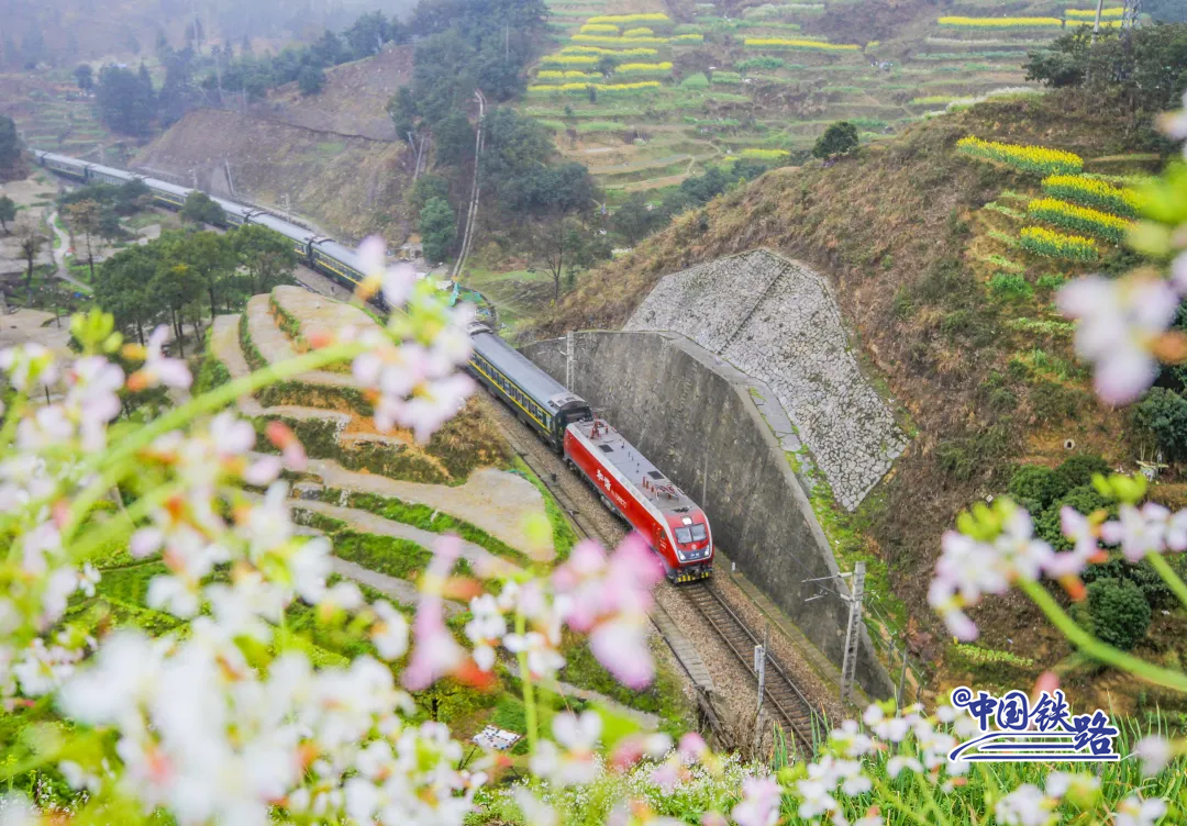 赣韶线旁盛开的洋紫荆花与列车同框。