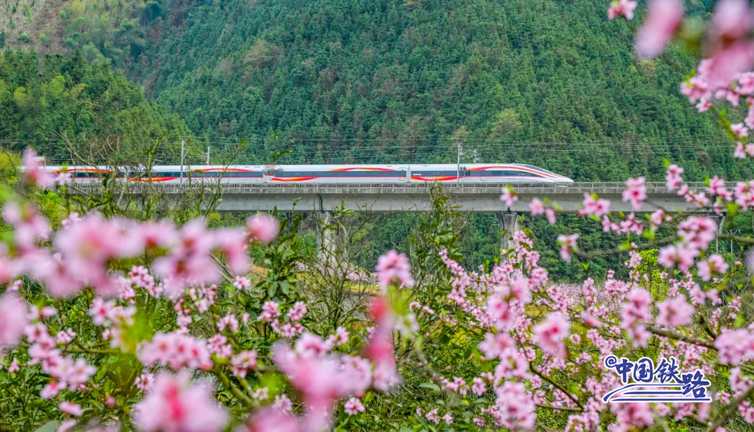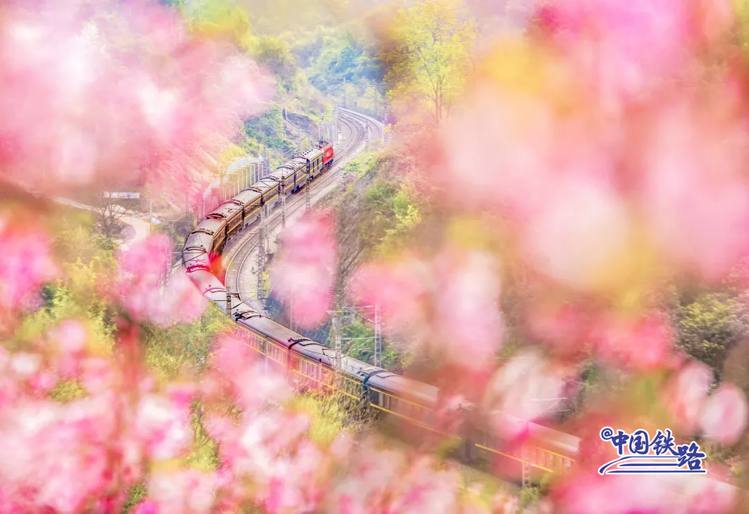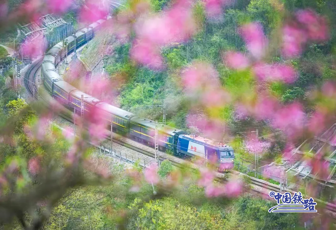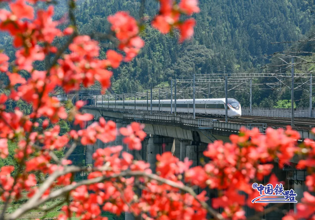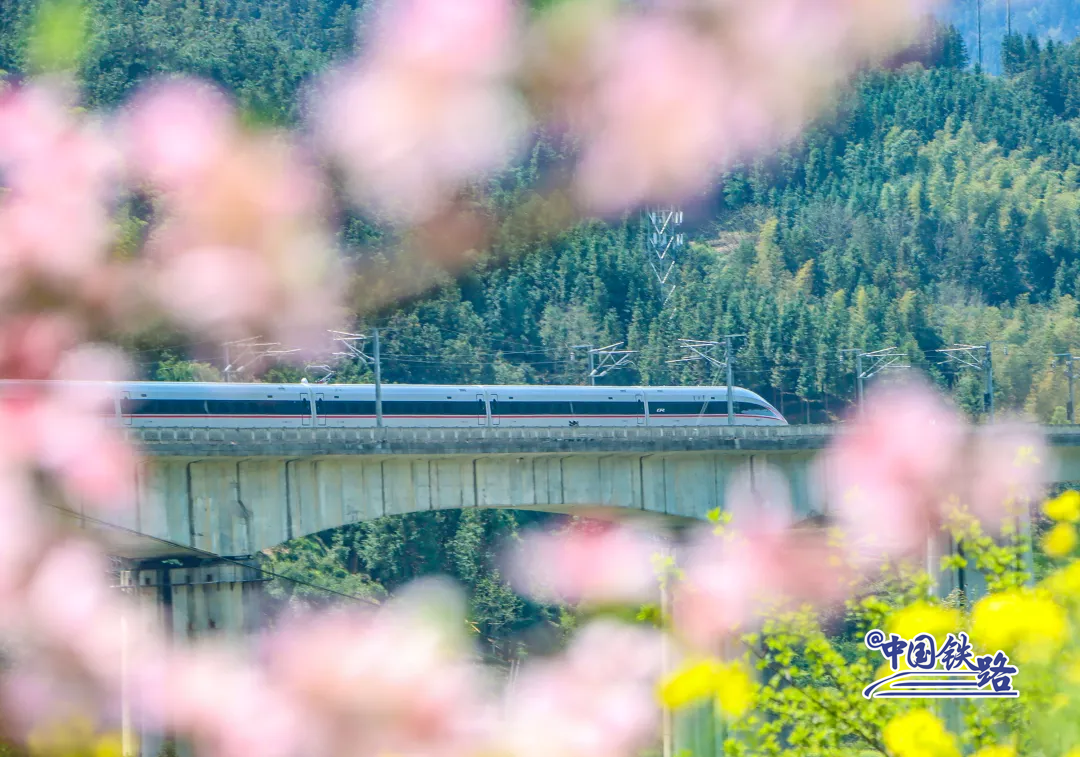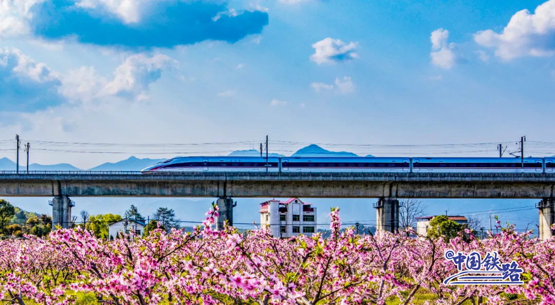赣韶线旁盛开的洋紫荆花与列车同框。