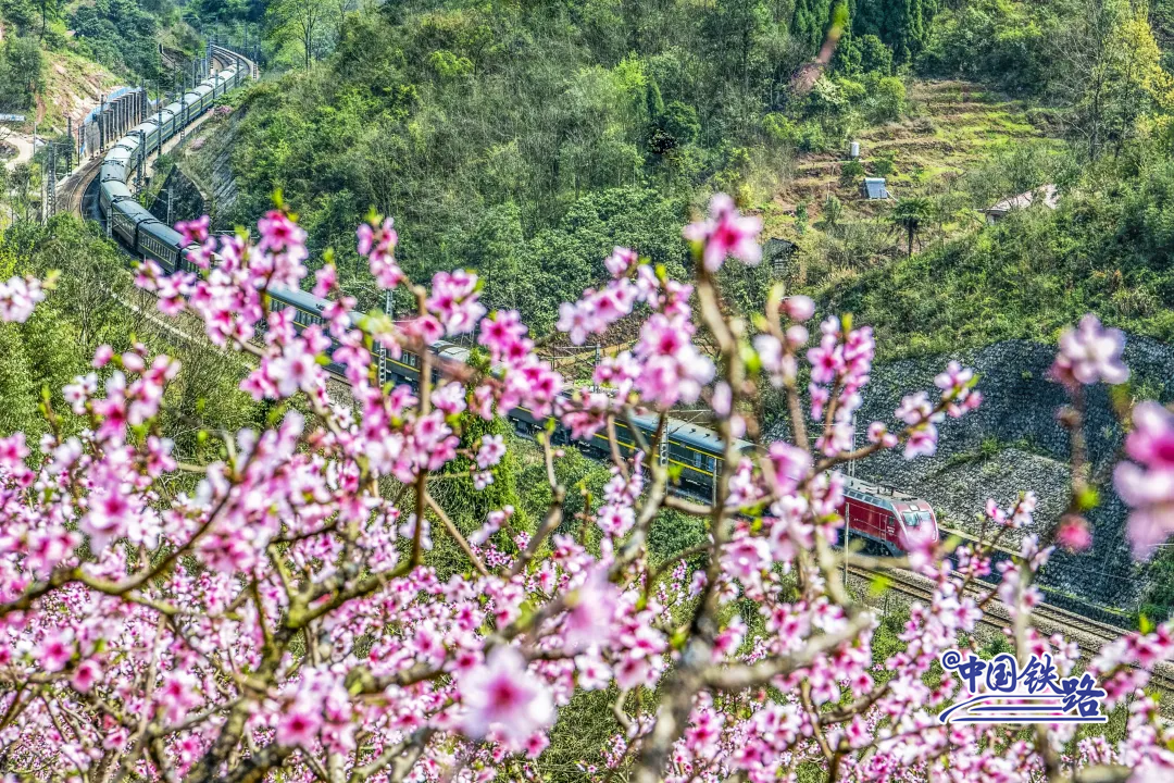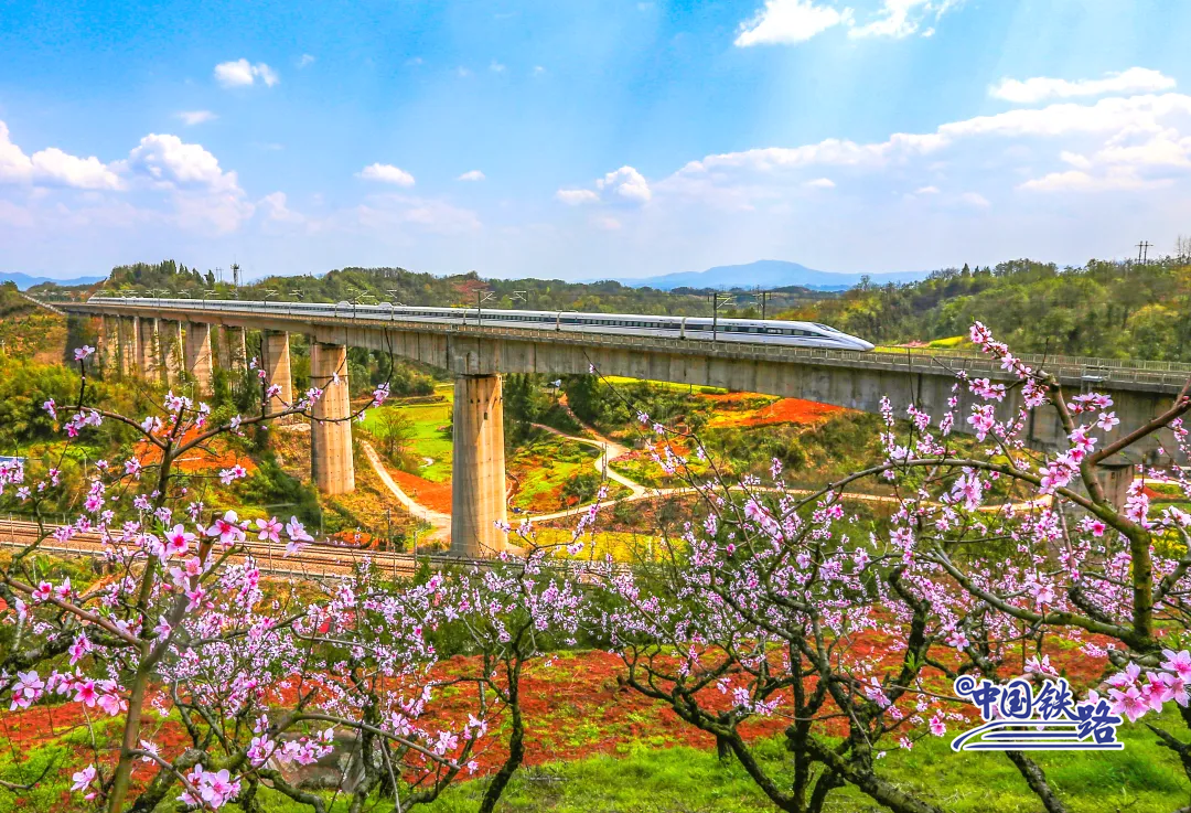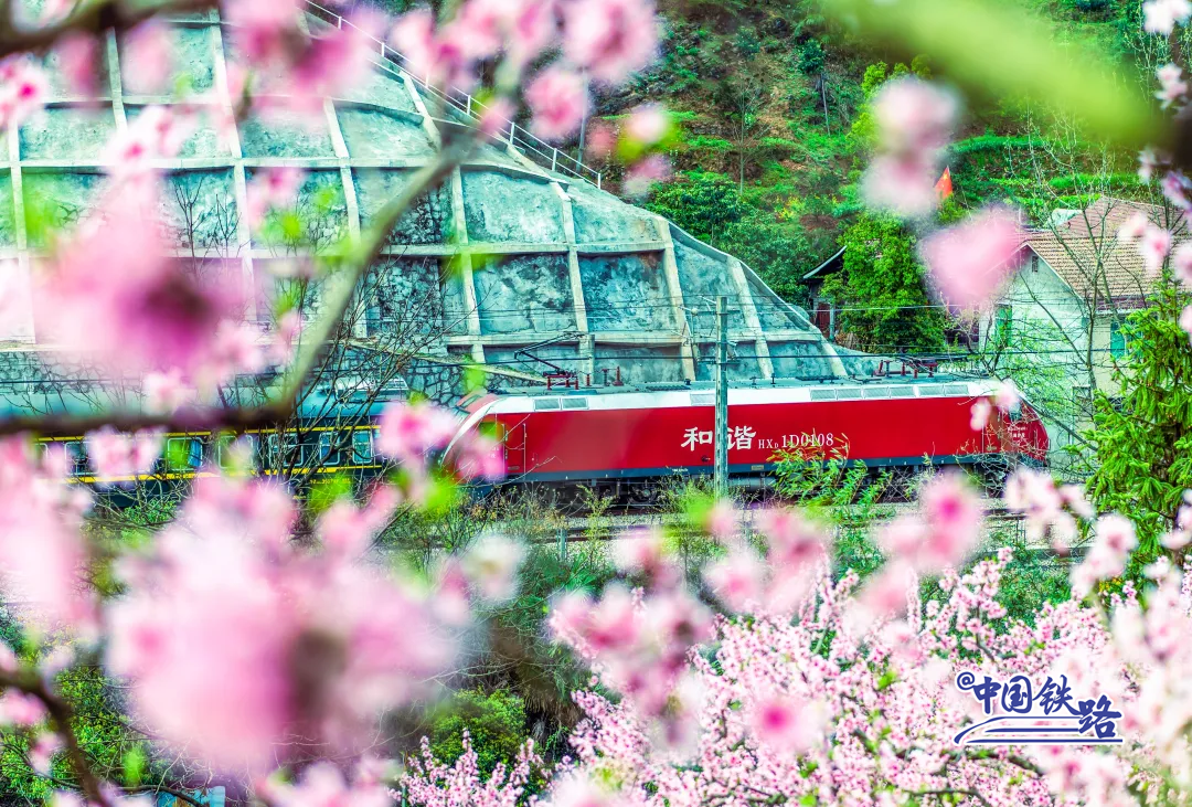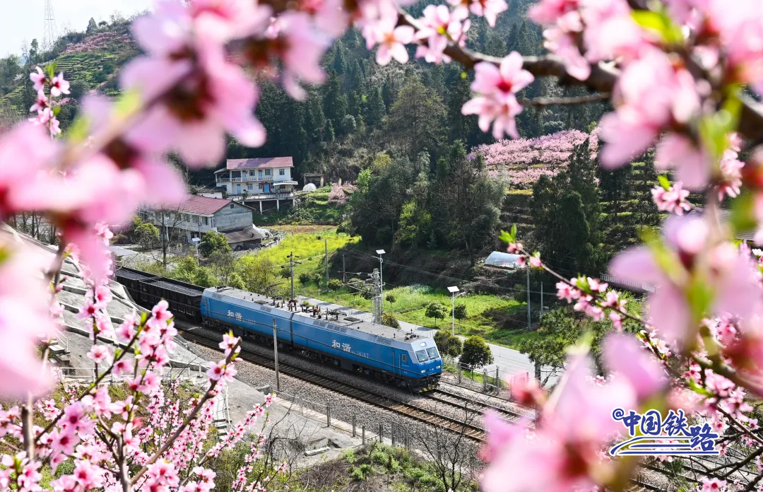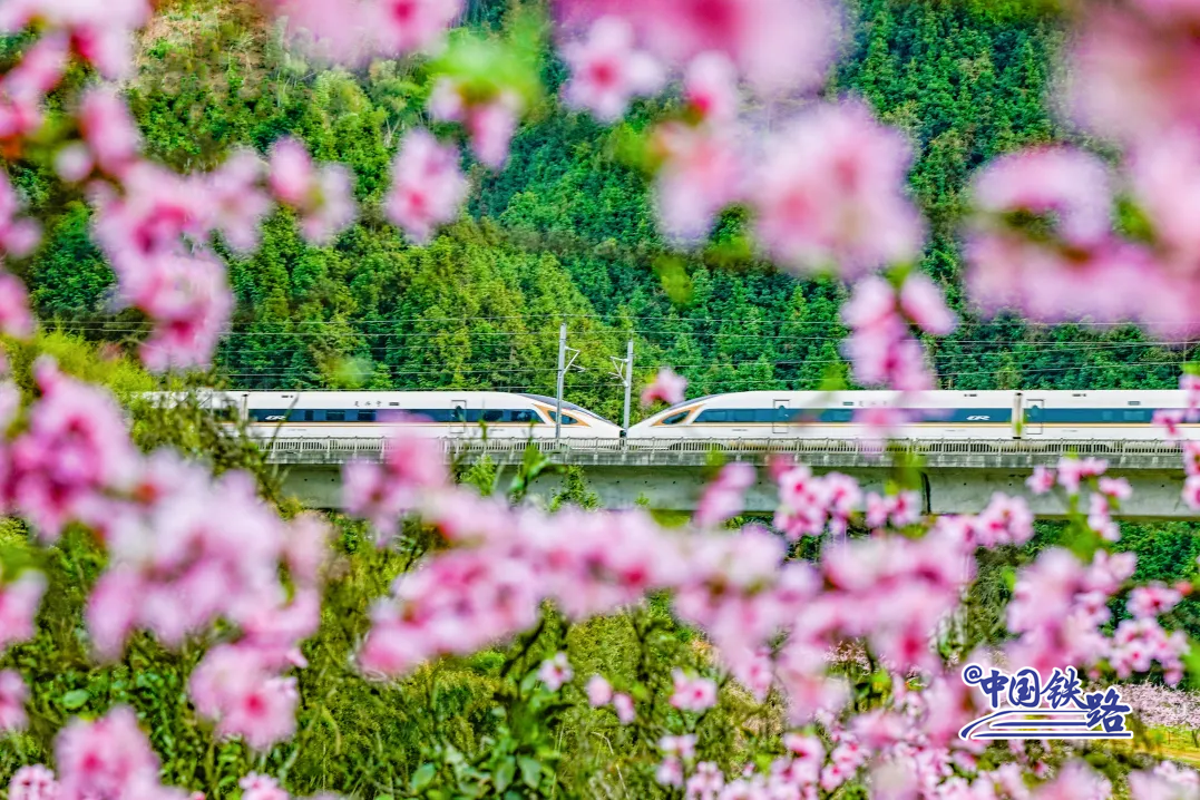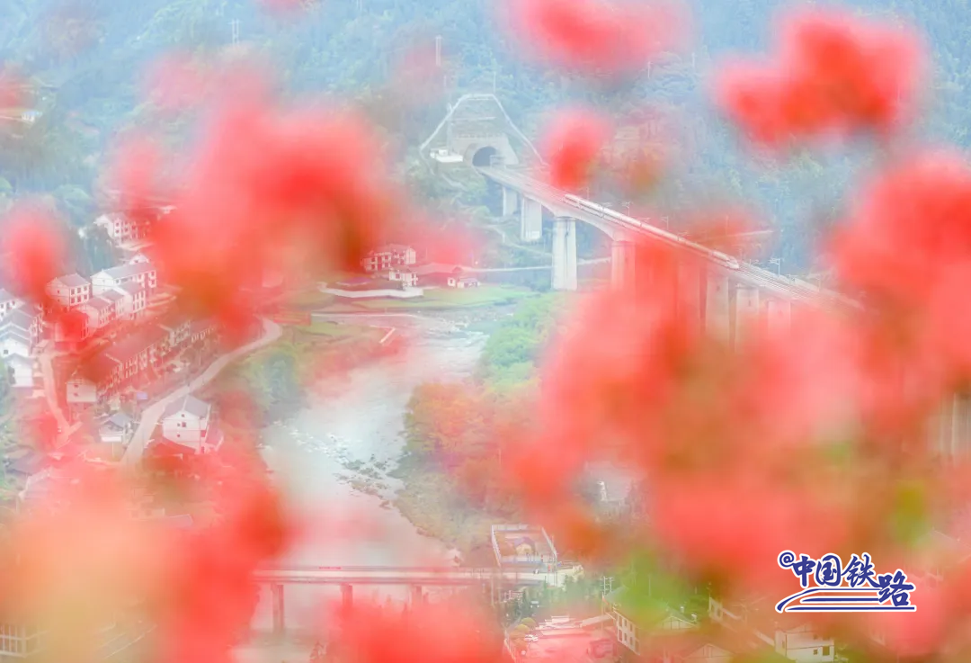 赣韶线旁盛开的洋紫荆花与列车同框。