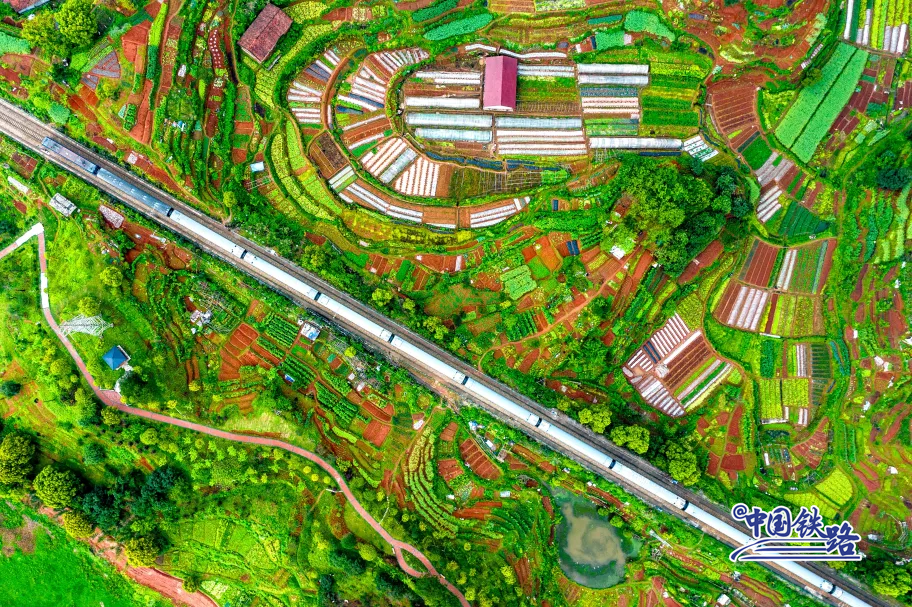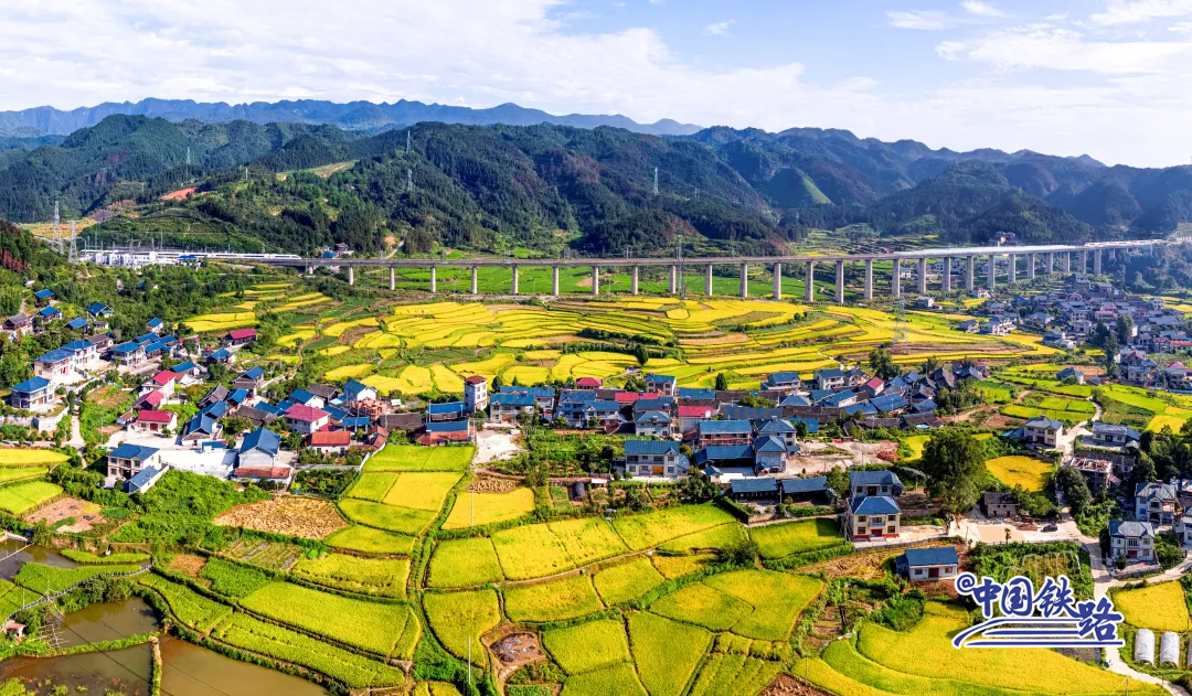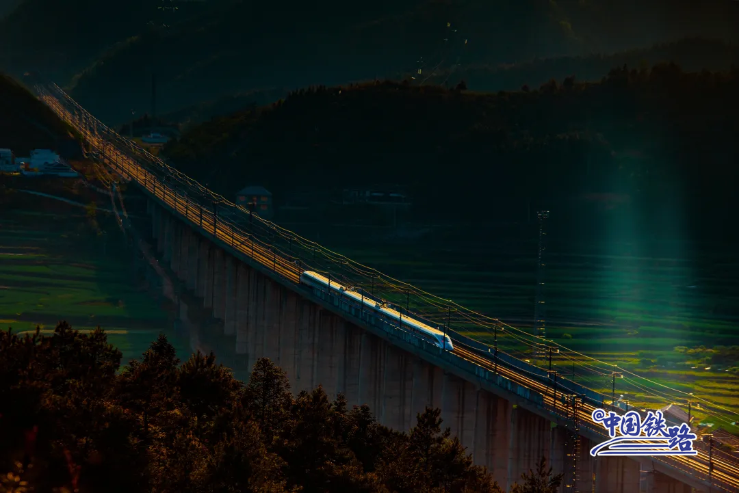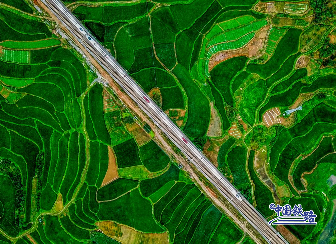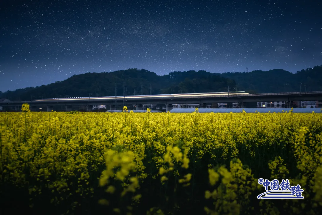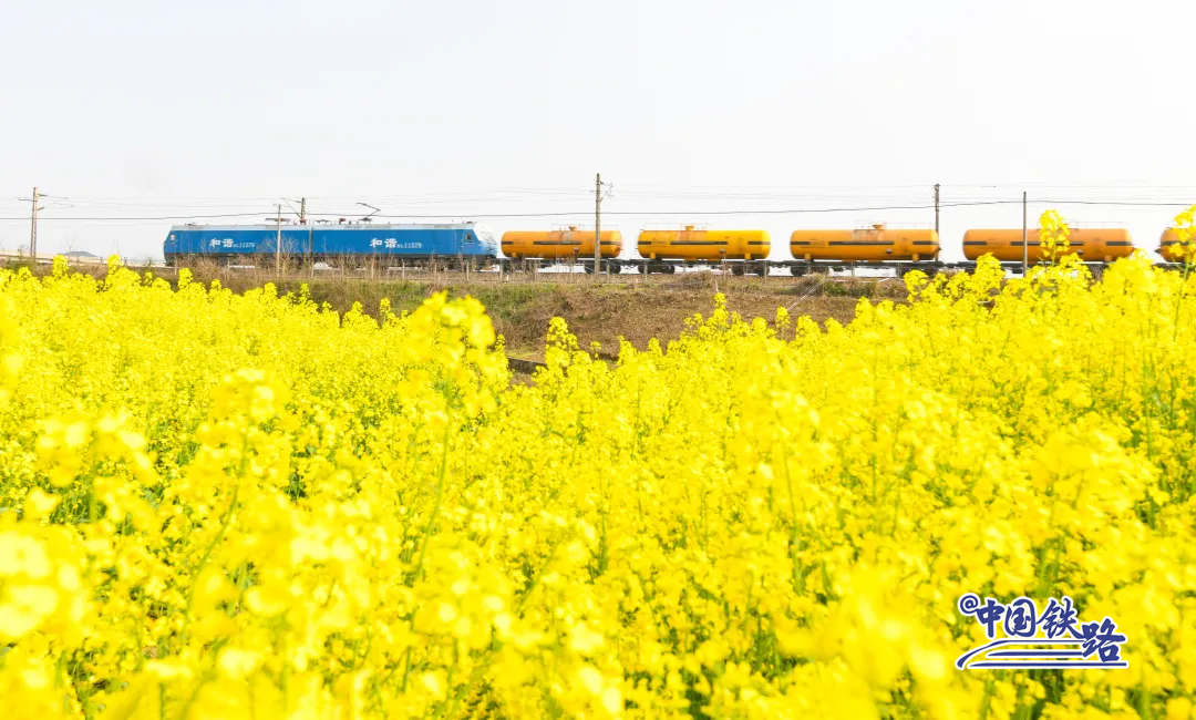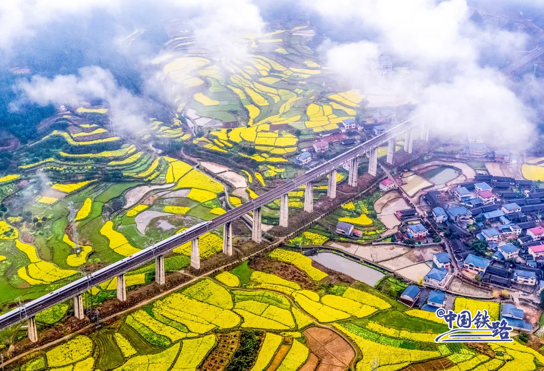动车组经过油菜花田,犹如穿梭在金色油画中。