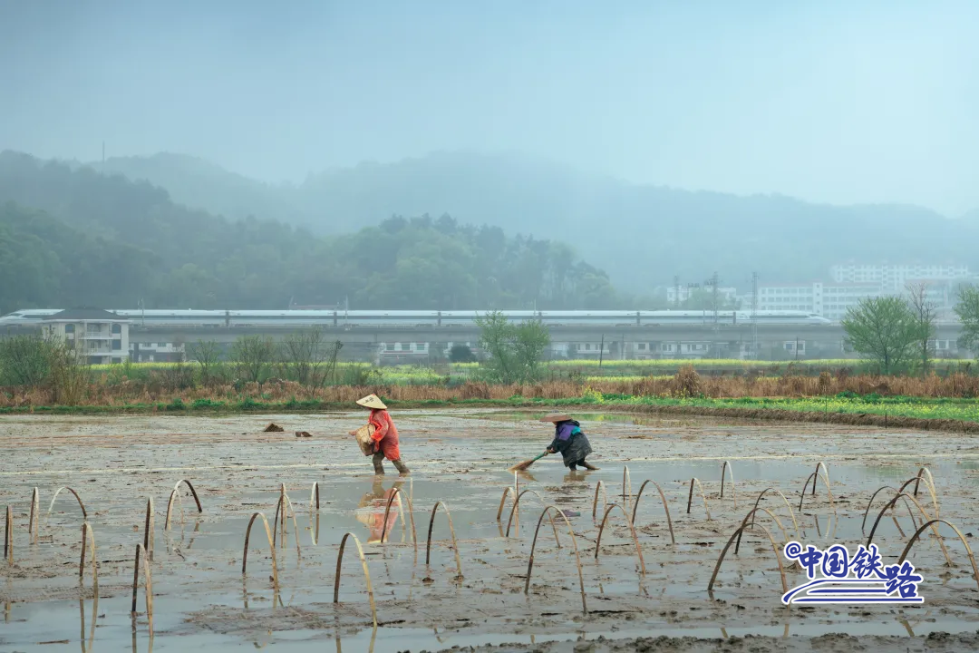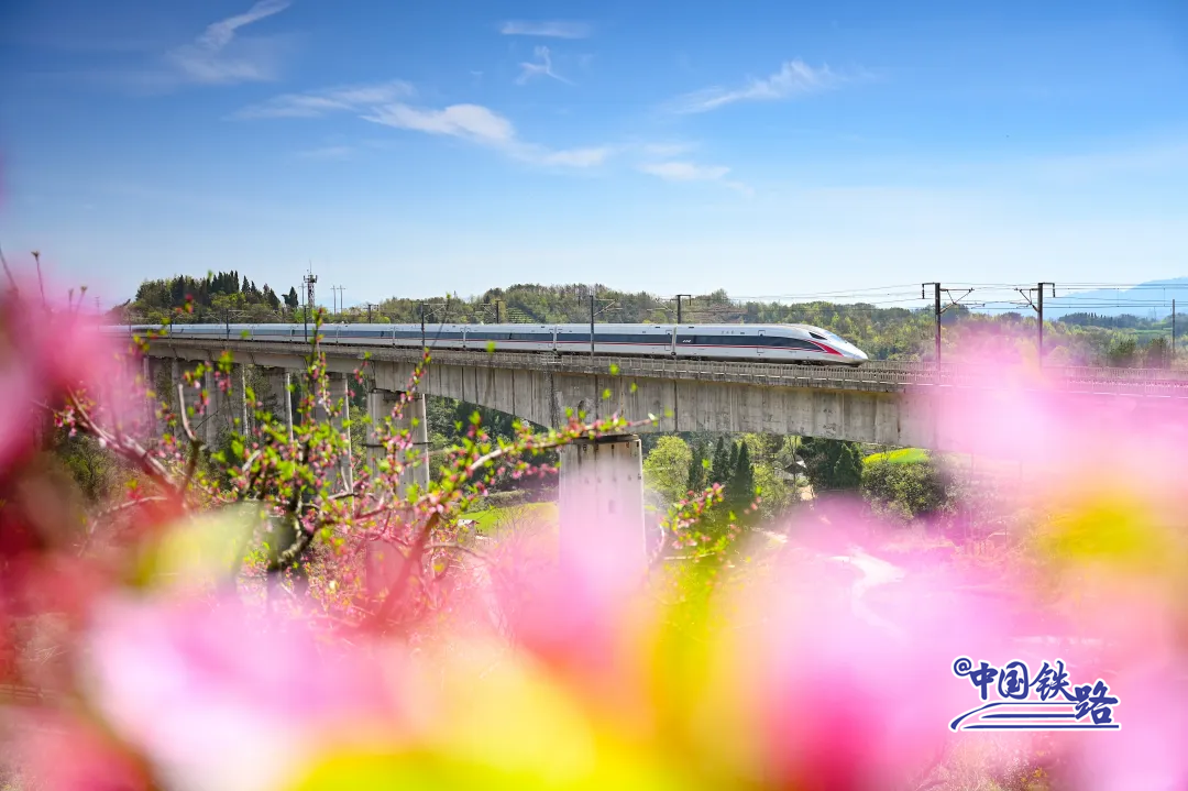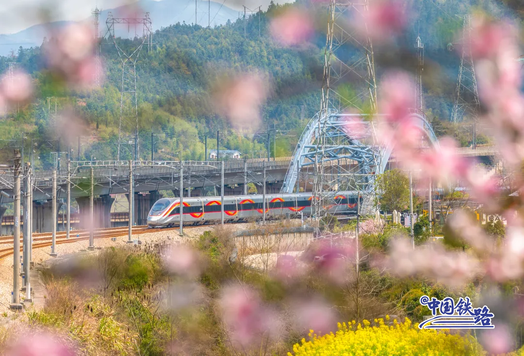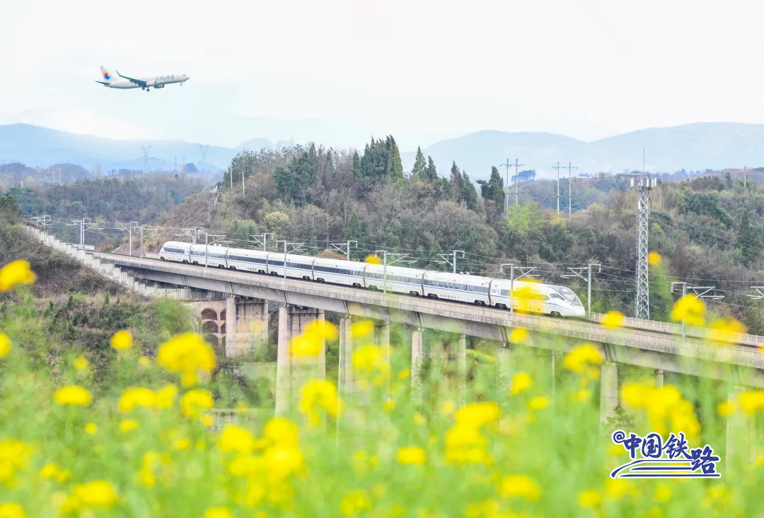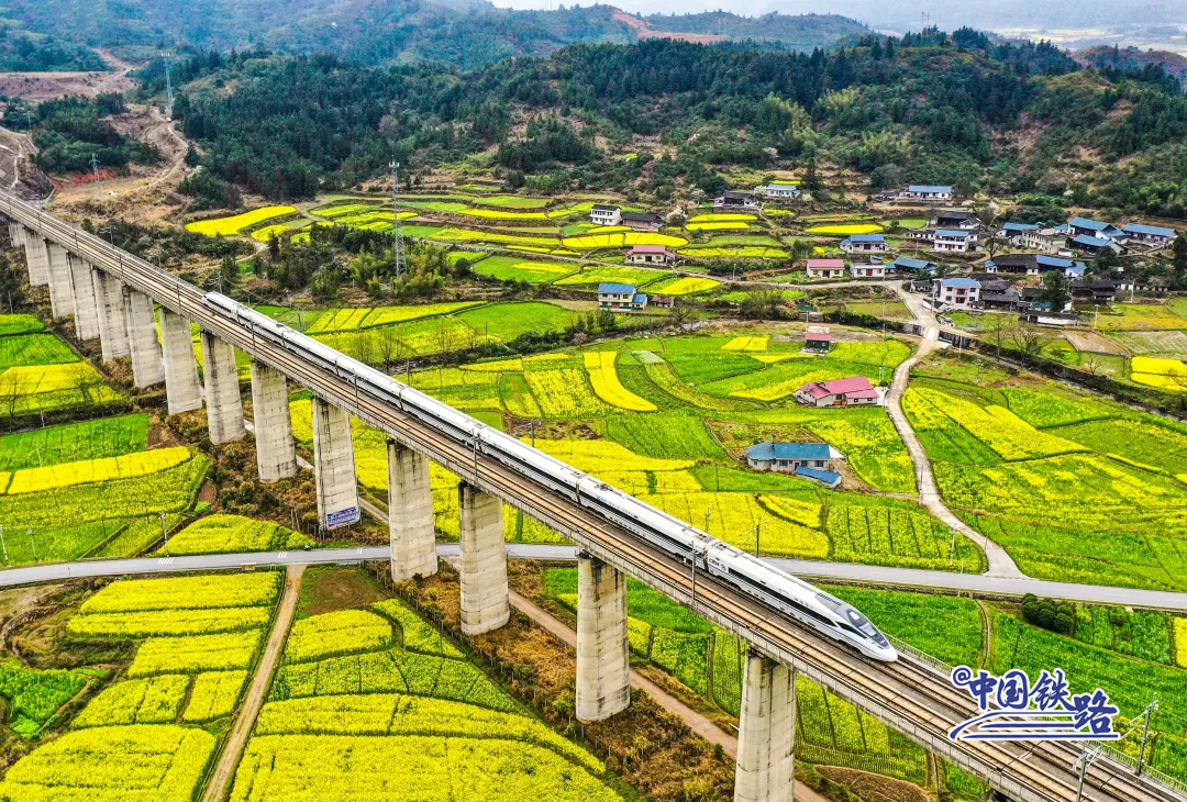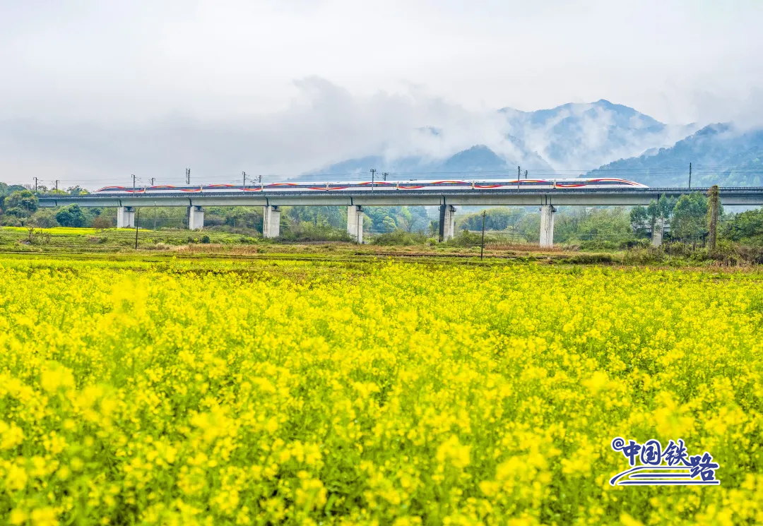 沪昆高铁上疾驰的动车组与油菜花同框。