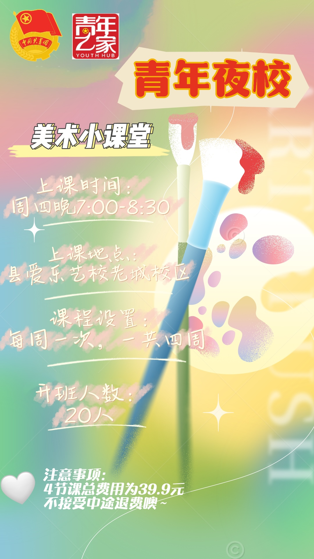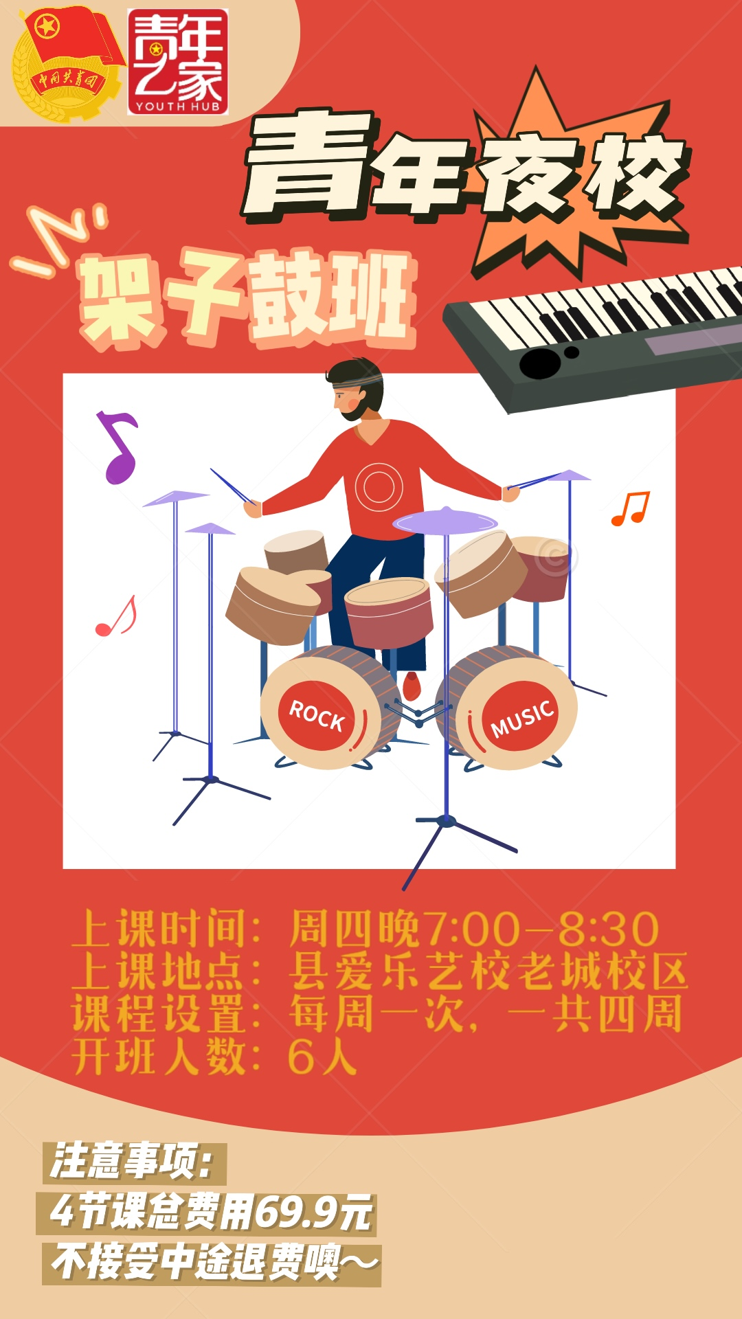 1.每人每期限报一门课程,每门课程每期收取基础费用。上第一次课时线下缴费,不接受中途退费;【不轻信来历不明的电话和信息,不向陌生人汇款、转账,做到“不轻信、不汇款、不转账”】