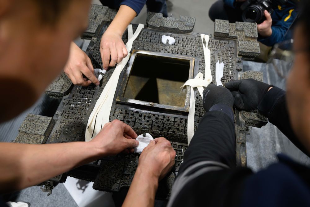 3月4日,在湖北省博物馆,工作人员在对文物铜鉴缶进行打包装箱。新华社记者 胡竞文 摄