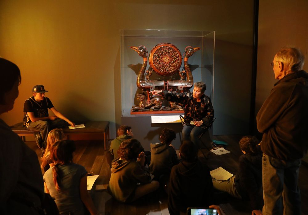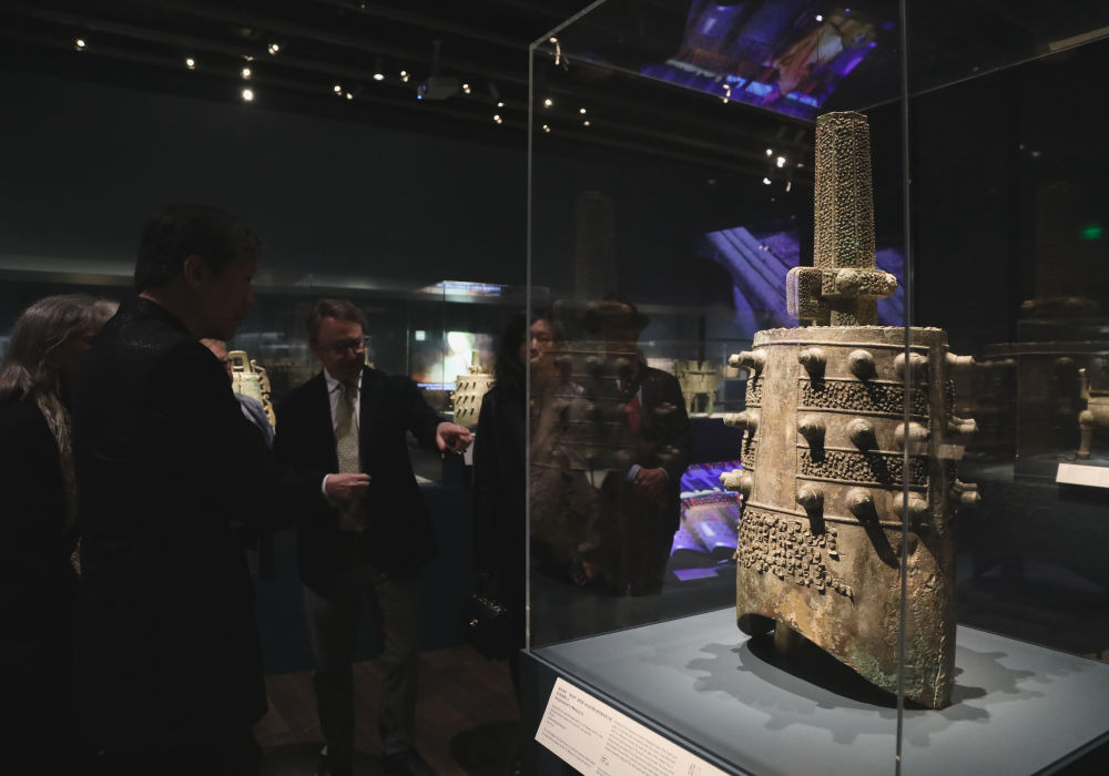 4月19日,观众在美国旧金山亚洲艺术博物馆举办的“凤凰故国——青铜时代曾楚艺术展”上参观。新华社发(刘艺霖摄)