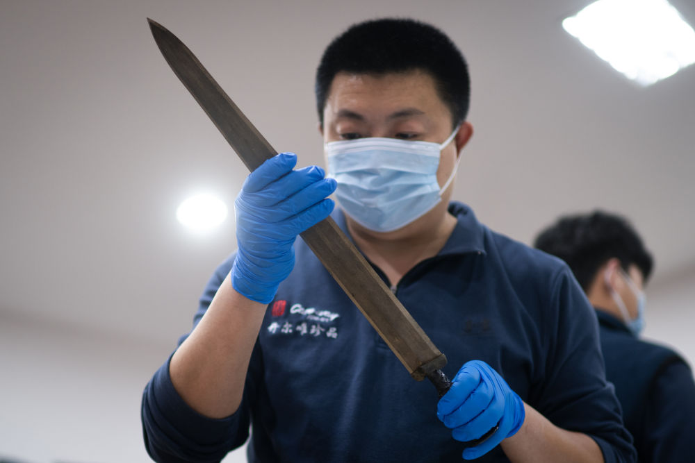 在湖北荆州博物馆,工作人员对越王州勾铜剑进行打包(2月28日摄)。新华社记者 肖艺九 摄