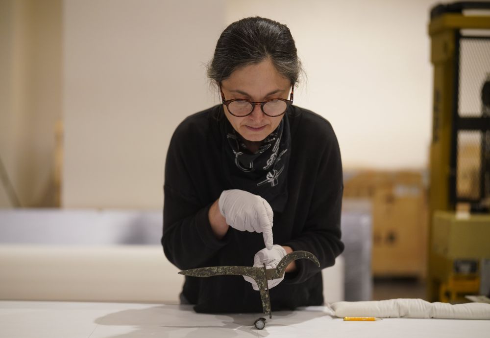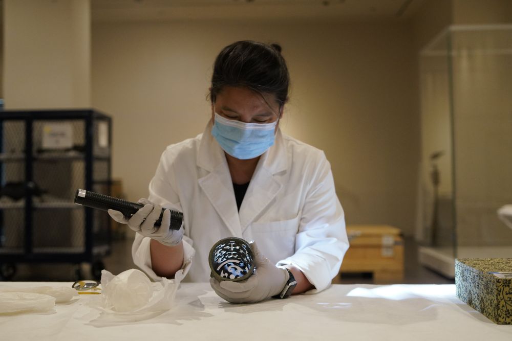 3月22日,在美国旧金山亚洲艺术博物馆,工作人员在查看展品。新华社记者 吴晓凌摄