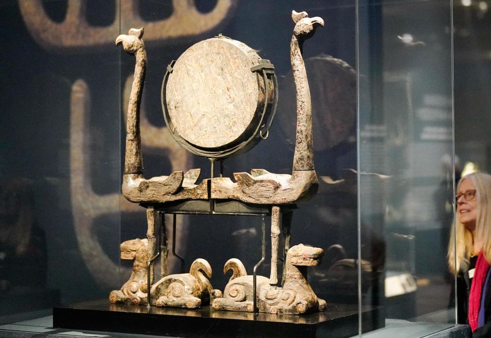 本次赴美展出的文物包括与曾侯乙编钟同时出土的铜鉴缶以及彩绘漆木虎座凤鸟悬鼓,前者是可在炎热夏季冷藏酒水的双层金属容器,被称为2400多年前的“冰箱”,后者代表了楚地风格鲜明的造型,也显示了楚人对凤鸟、神兽的崇敬和喜爱。