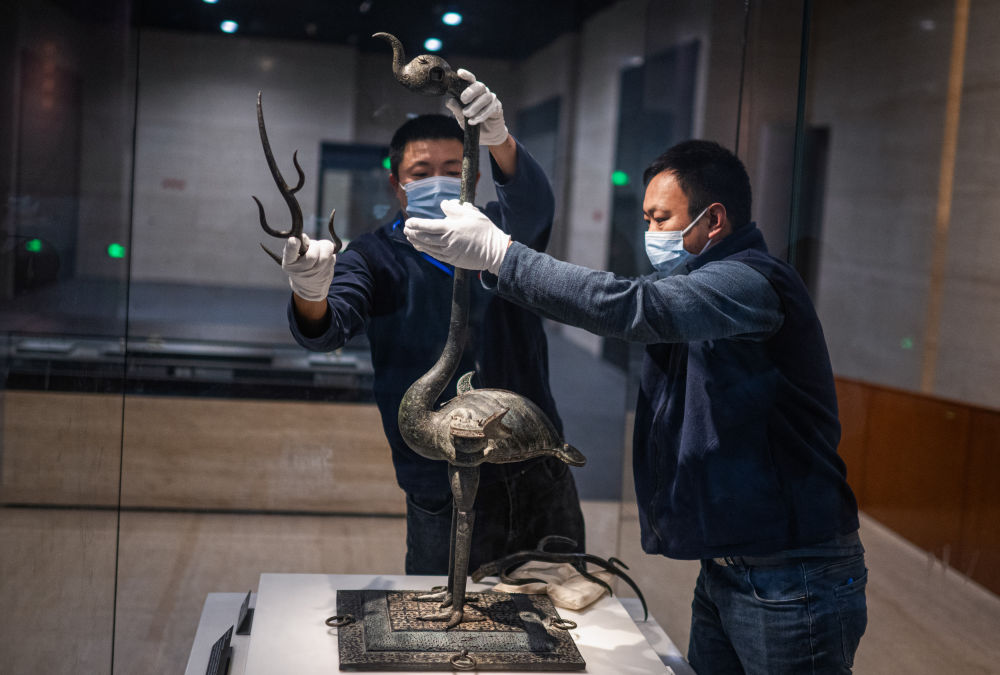 在湖北省博物馆曾侯乙展厅,工作人员对铜鹿角立鹤进行拆装打包(3月4日摄)新华社记者 肖艺九 摄