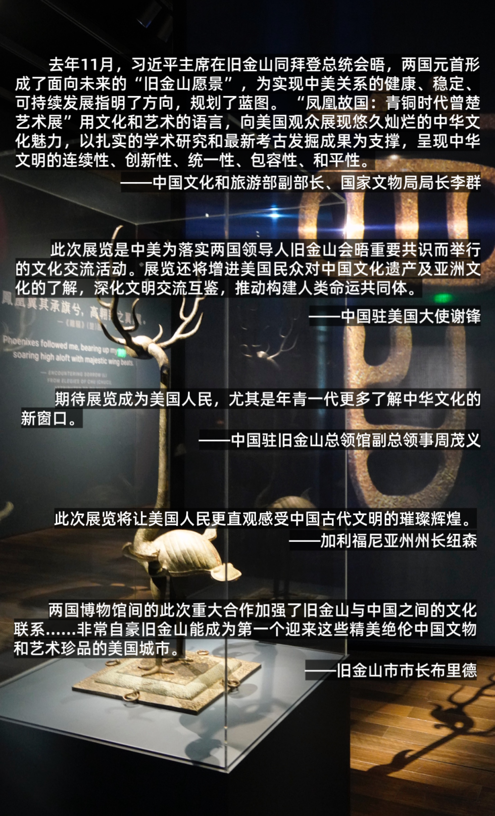 这次展览由中国国家文物局指导,湖北省博物馆和旧金山亚洲艺术博物馆联合主办,荆州、随州、宜昌、襄阳博物馆合办,是近年中国在美国举办的规模最大的文物展览。为了向西方观众近距离呈现精彩绝伦的中华文明,湖北与旧金山方面为此筹备多年……
