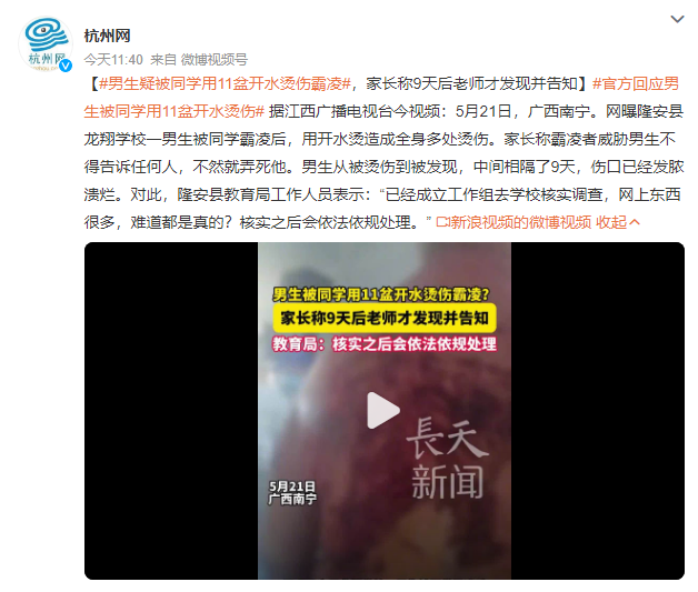 5月21日,广西南宁。网传隆安县龙翔学校一男生被同学霸凌后,用开水烫造成全身多处烫伤。家长称霸凌者威胁男生不得告诉任何人,不然就弄死他。男生从被烫伤到被发现,中间相隔了9天,伤口已经发脓溃烂。对此,隆安县教育局工作人员表示,已经成立工作组去学校核实调查,核实之后会依法依规处理。