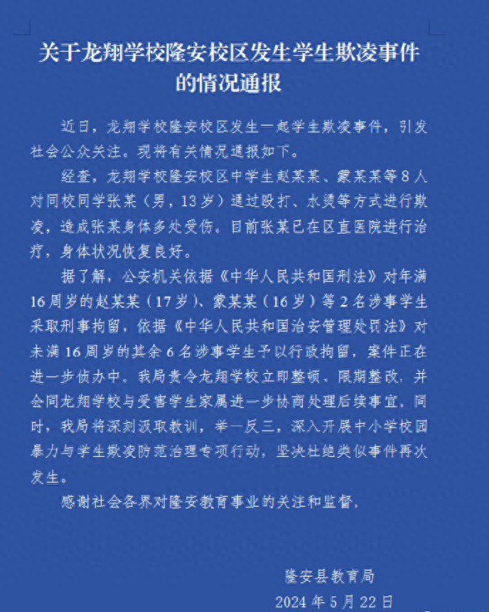 5月22日,广西南宁,据隆安县教育局通报:近日,龙翔学校隆安校区发生一起学生欺凌事件,引发社会公众关注。