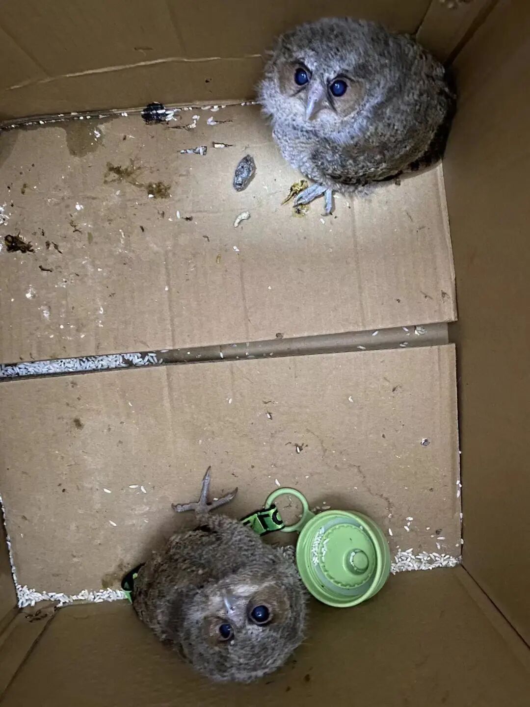 接警后,民警迅速赶往现场了解情况。只见两只外表毛茸茸、配上花斑羽毛的大眼“萌宝”猫头鹰躲在墙角处。经初步检查,两只小猫头鹰身体无明显外伤,可能是饥饿等原因体力不支无法起飞,民警伙同村民一起将两只小猫头鹰装进纸箱内带回派出所。