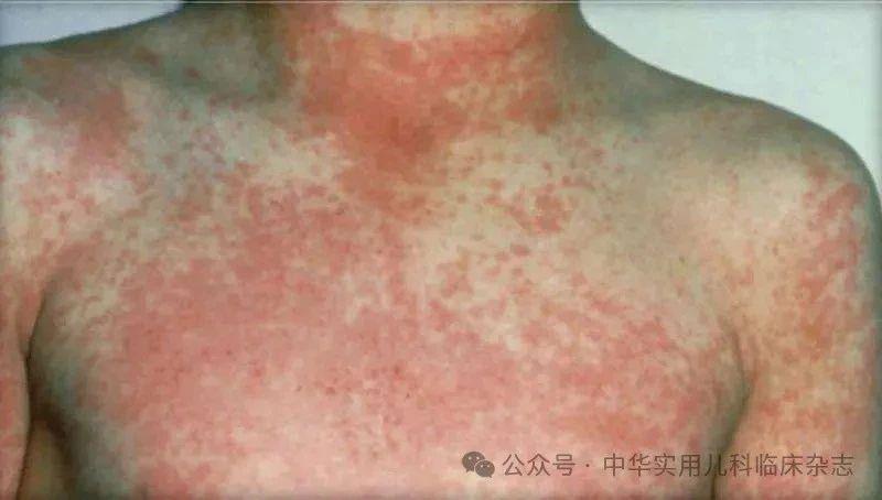 典型的皮疹为在皮肤上均匀分布,压之褪色,伴有痒感,消退后皮肤会脱屑。皮肤褶皱处可出现“帕氏线”。