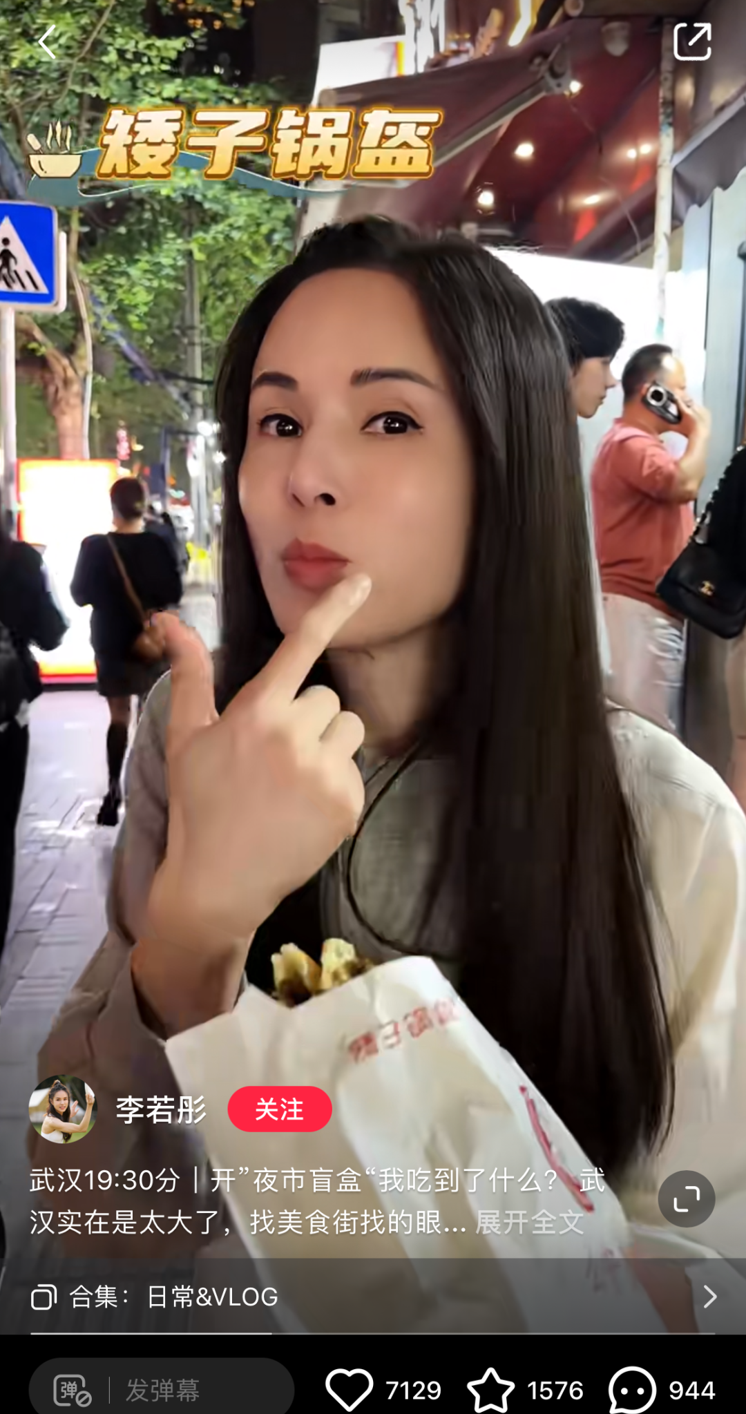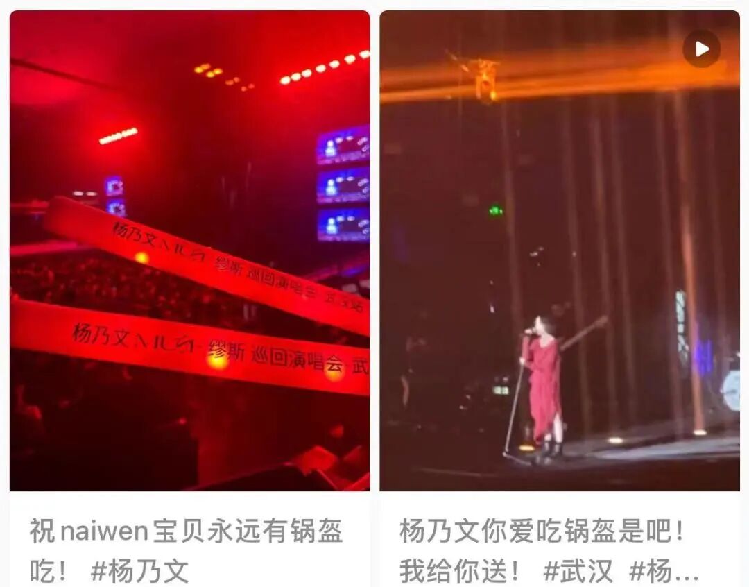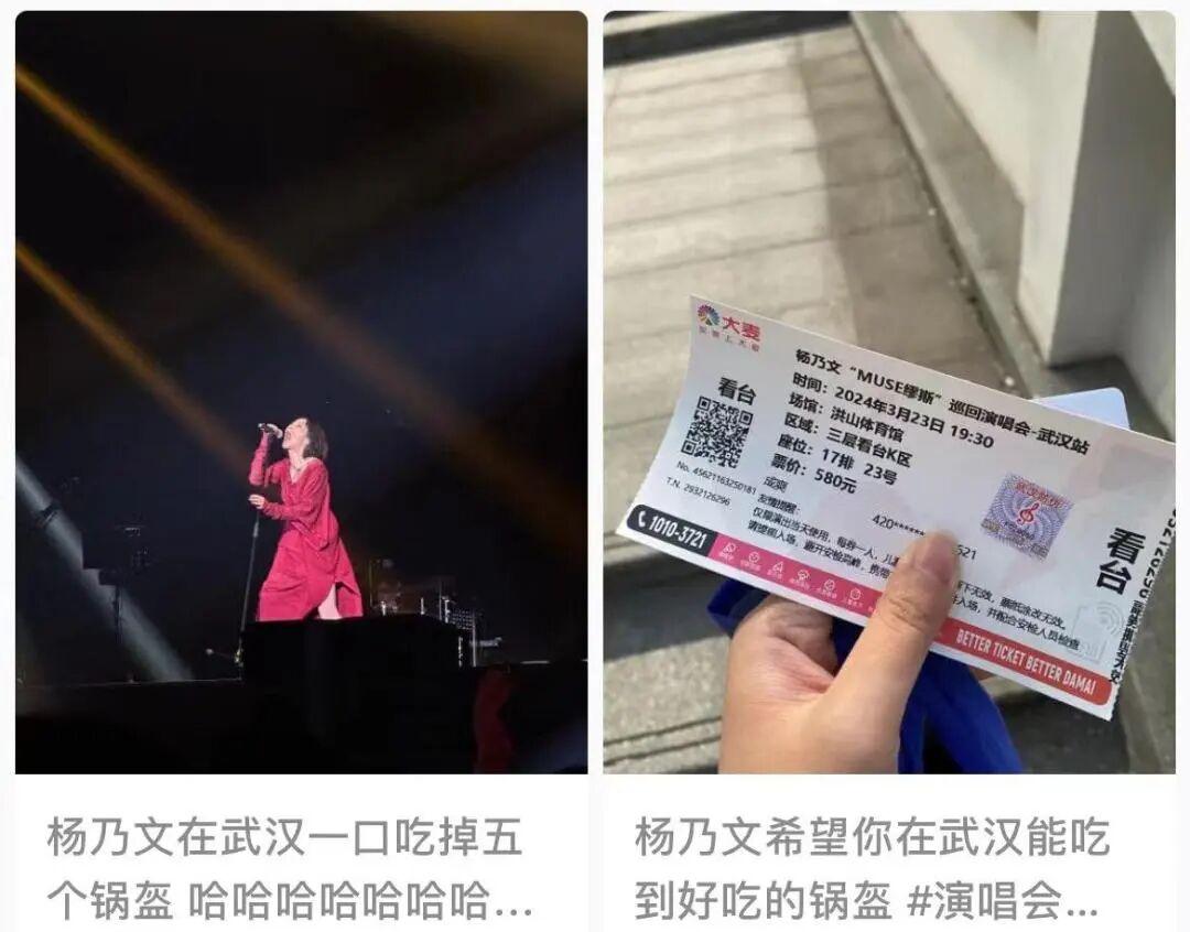 ○今年春天,中国台湾歌手杨乃文来武汉开演唱会,她的第一段talking是:“我刚刚点了锅盔外卖,但是它送不到这里……我不知道为什么,我很爱锅盔,我无法解释。”