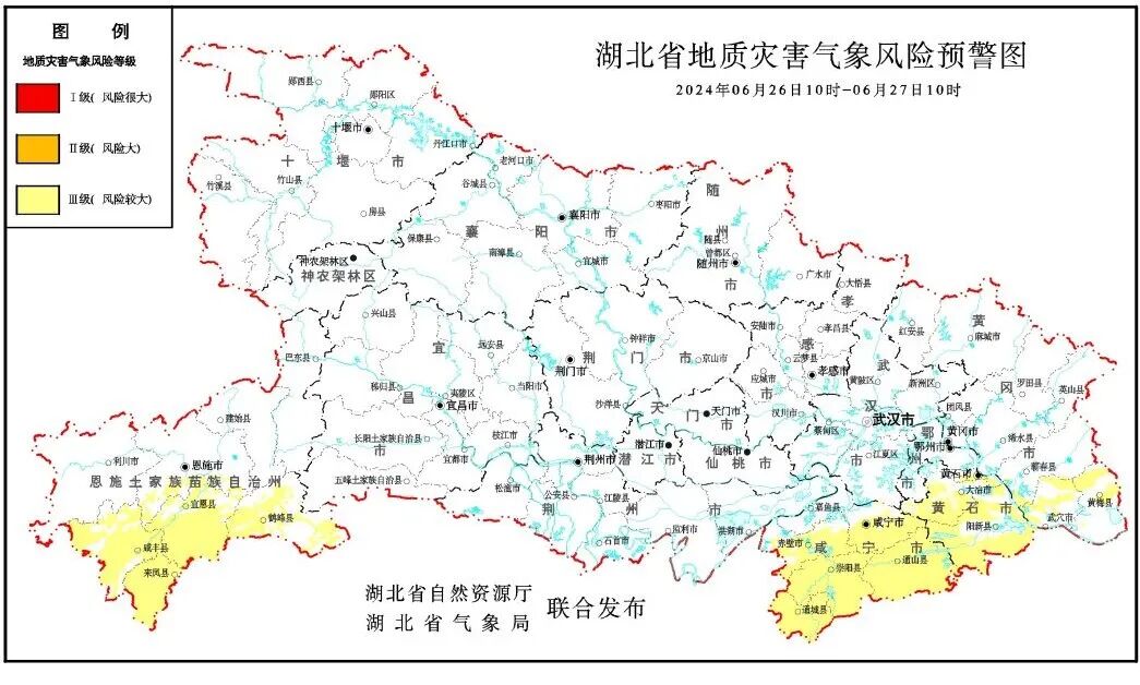 2024年6月26日10时—6月27日10时,预计黄石地区,恩施(恩施市南部、咸丰、来凤、宣恩、鹤峰)、咸宁(咸安区、赤壁、崇阳、通城、通山)、黄冈(蕲春西南部、武穴、黄梅),以及其他强降水区域发生崩塌、滑坡、泥石流的风险较大。