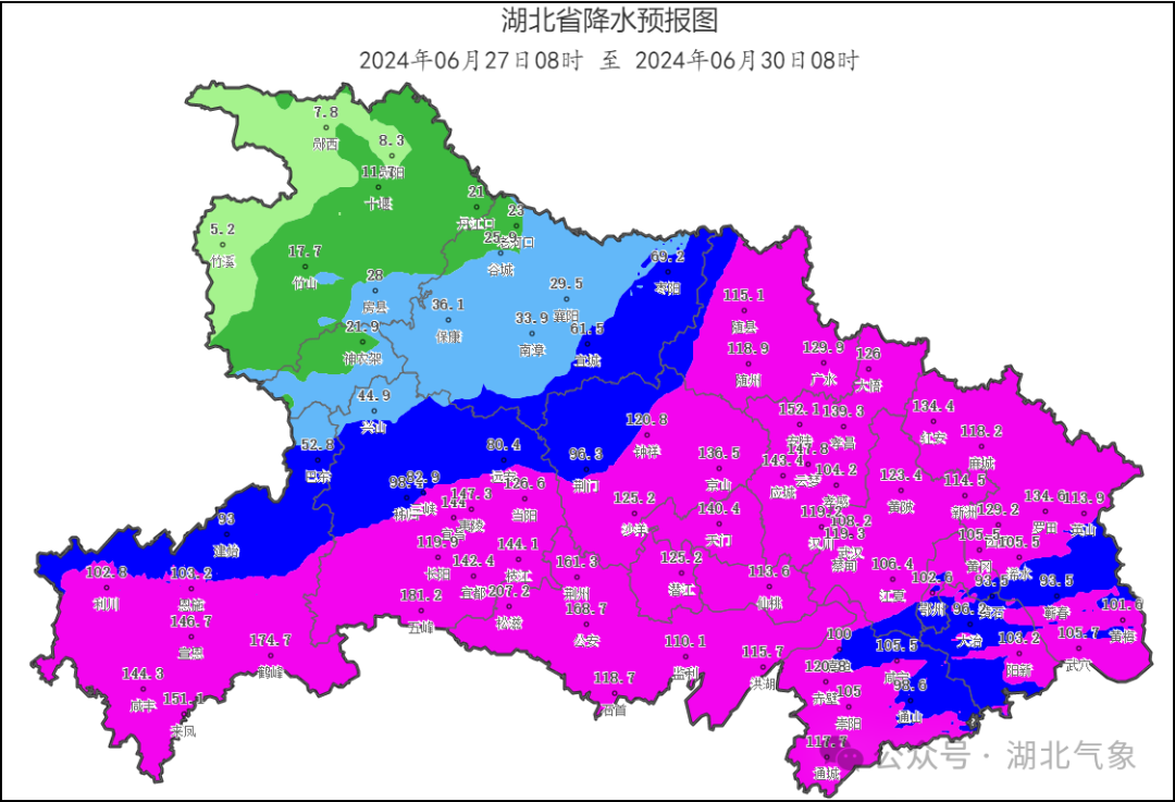 6月27日8时至6月30日8时累计雨量:鄂西南、江汉平原及以东地区80~150毫米,部分地区200~250毫米,单点300毫米以上;鄂西北30~80毫米。