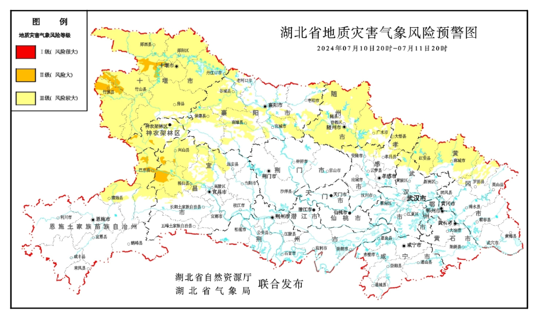 2024 年 7 月 10 日 20 时—7 月 11 日 20 时,预计三峡库区,神农架林区、十堰地区、襄阳地区、随州地区,宜昌(远安、长阳北部)、恩施(建始北部和中部)、孝感(大悟、安陆、孝昌)、武汉(黄陂北部)、黄冈(红安、麻城、罗田)以及其他强降水区域发生崩塌、滑坡、泥石流的风险较大;其中,三峡库区(巴东北部、兴山西南部、秭归中西部),神农架林区西部局部、十堰(十堰市西部城区、郧阳西南部、竹山西北部、竹溪北部)发生崩塌、滑坡、泥石流的风险大。