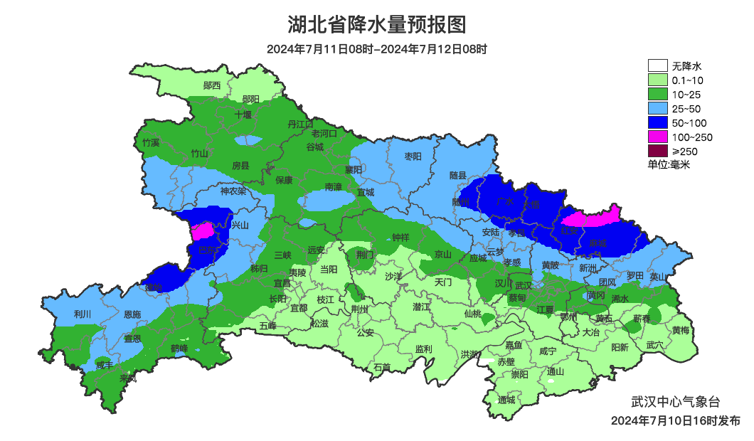 预计未来三天(11-13日),西部、北部仍有较强降水发生,部分地区有大到暴雨,局地大暴雨。今天06时47分武汉中心气象台已发布暴雨黄色预警:预计11日08时至12日08时,十堰南部、神农架、恩施北部、宜昌西部、随州、孝感北部、武汉北部、黄冈北部有大到暴雨,局地大暴雨。