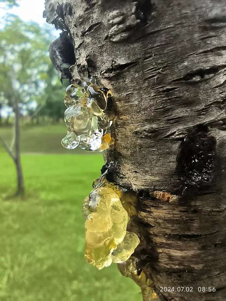 近日,很多人在小区绿化带、野外公园等地的桃树上,发现了一块块黄褐色、晶莹剔透的物体,呈透明或半透明质地。