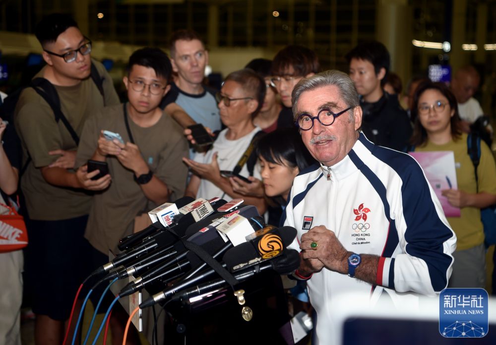 ↑中国香港体育代表团团长施文信(前)接受媒体采访。
