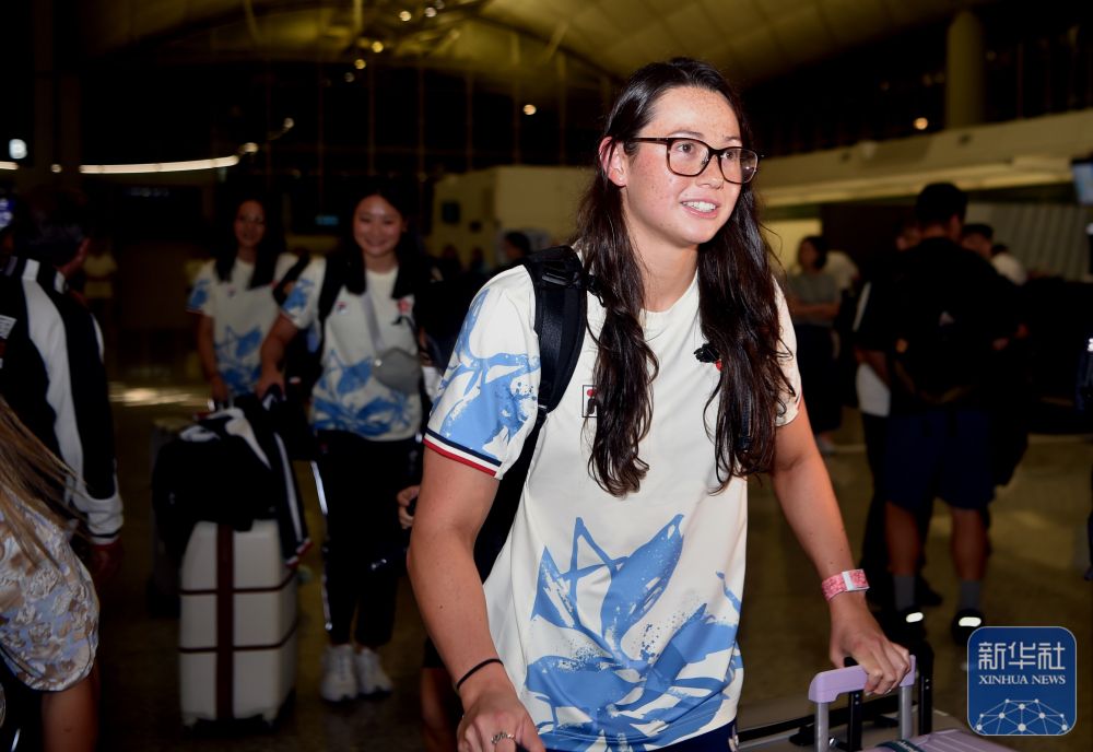 ↑中国香港游泳运动员何诗蓓来到机场大厅候机。