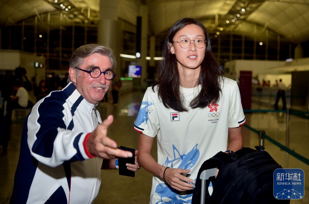 ↑中国香港体育代表团团长施文信(左)与游泳运动员谭凯琳在机场大厅候机。