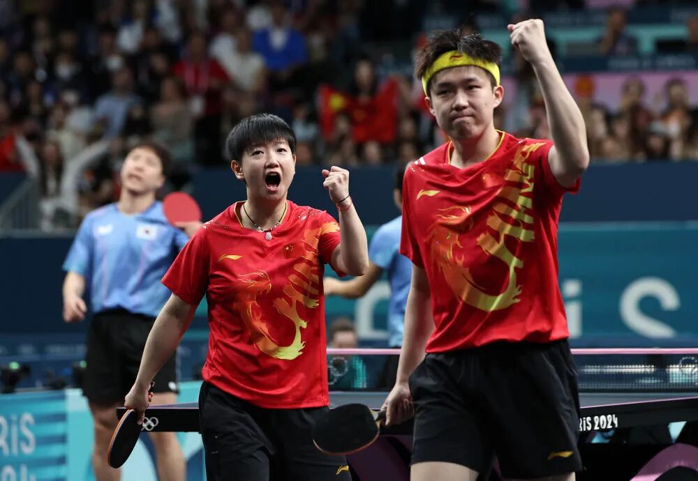 △ 7月29日,王楚钦/孙颖莎(左)在比赛中庆祝得分。 图源新华体育
