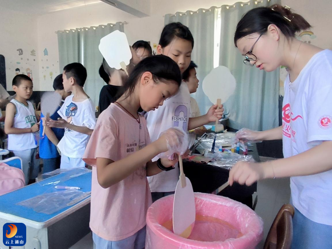 云上通山报道:(通讯员 释传玉)为切实帮助化解暑期青少年无人看管难题,助力少年儿童健康快乐成长,近日,共青团通山县团委、洪港镇团委联合湖北科技学院星火支教团队在洪港镇车田小学“暑假学堂”爱心托管班开展“”漆扇绘风华 传承绽光芒”漆扇小课堂活动。青年志愿者陈枢钰带领青少年走近漆扇的艺术之旅,他们怀着对传统文化的敬畏之心,积极地参与到漆扇的制作中来。