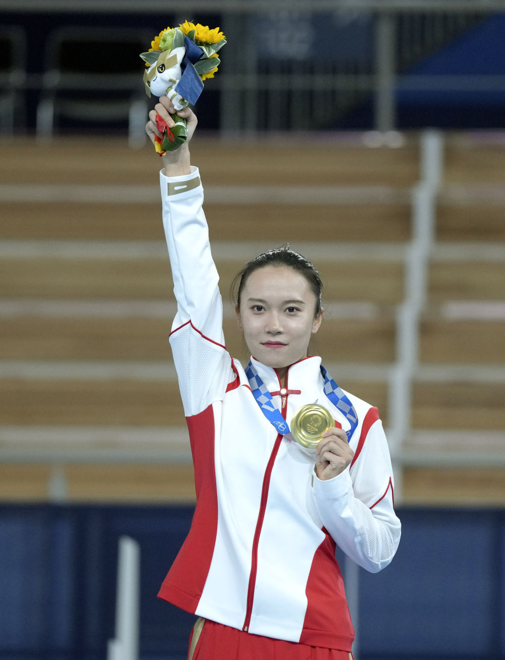2021年7月30日,中国选手朱雪莹在颁奖仪式上。当日,在东京奥运会蹦床项目女子决赛中,中国选手朱雪莹夺得冠军。新华社记者 程敏 摄