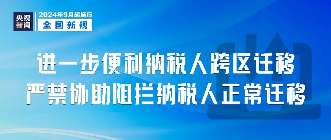 国家税务总局发布通知,自9月1日起,进一步便利纳税人跨区迁移,服务全国统一大市场建设。通知明确,简化发票使用手续。对使用电子发票的纳税人,信息系统自动将其发票额度转至迁入地。通知强调,严禁协助阻拦纳税人正常迁移。