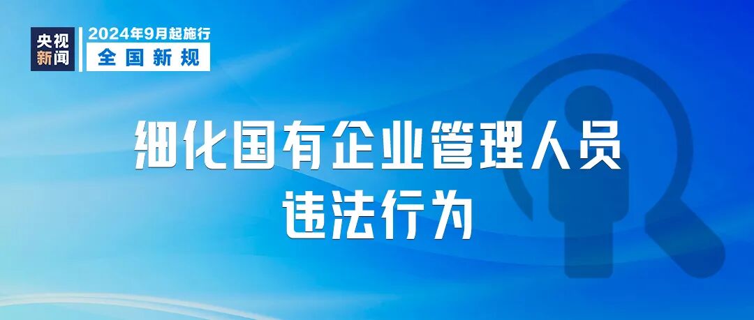 《国有企业管理人员处分条例》自9月1日起施行。《条例》细化国有企业管理人员违法行为,并明确相应的处分,包括六类:警告、记过、记大过、降级、撤职、开除。