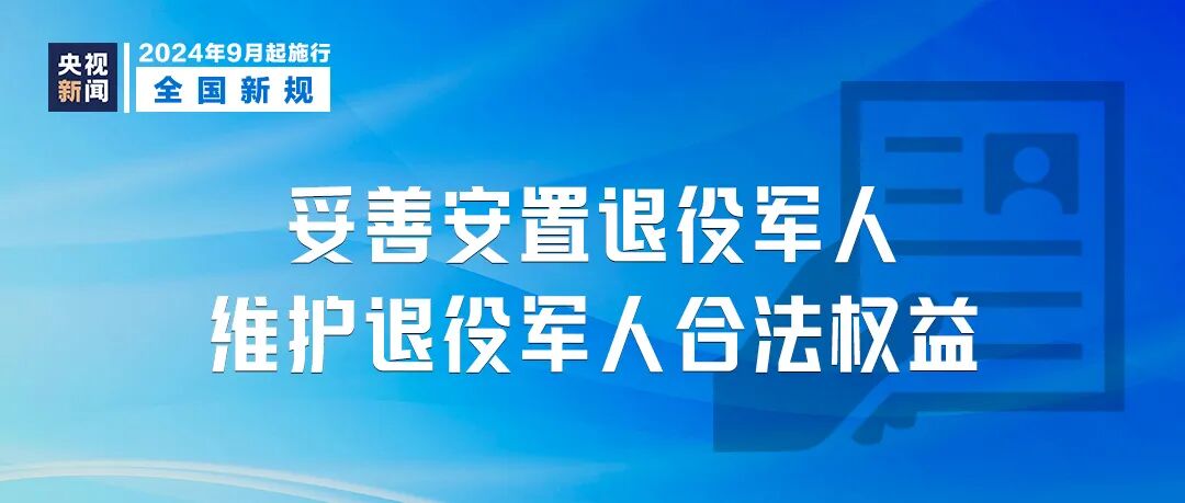 《退役军人安置条例》自9月1日起施行。《条例》明确退役军官和退役军士、义务兵的安置方式;要求军地开展退役前后技能培训,加强退役军人就业创业扶持等;明确军人退出现役后依法享受相关待遇保障。