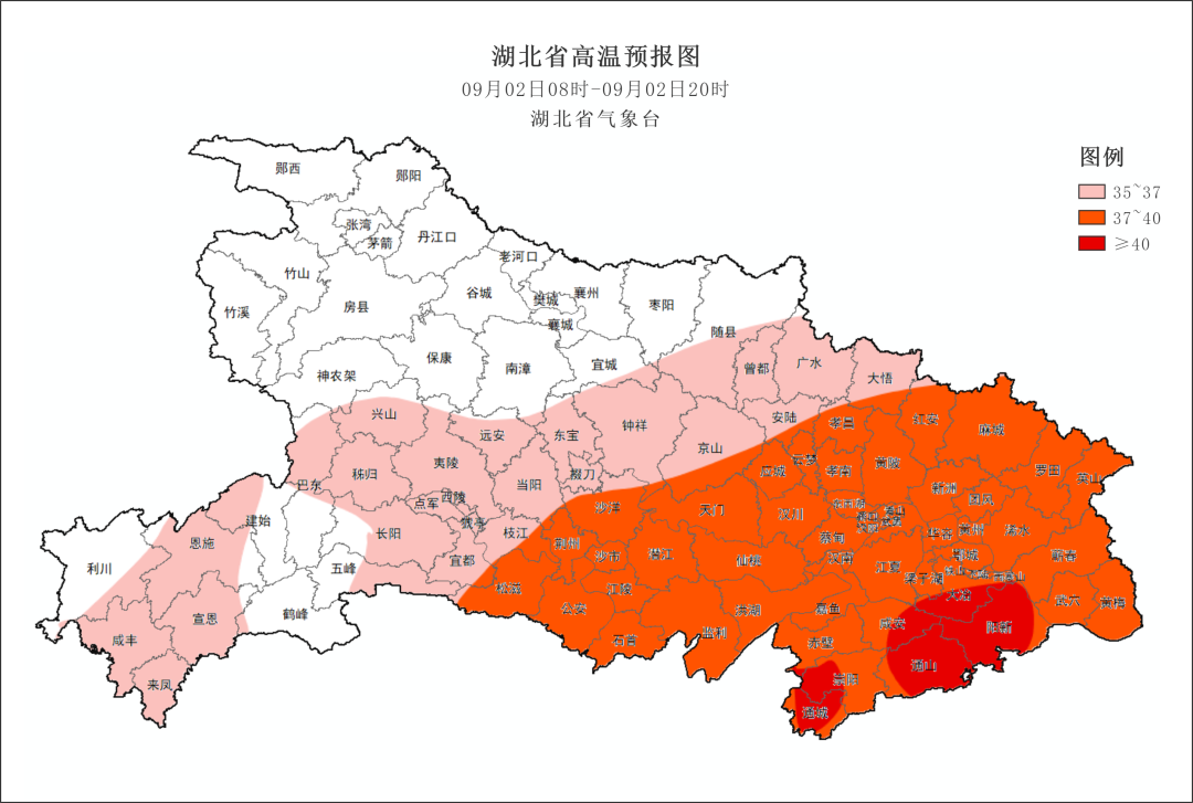 预计9月2日白天,除十堰、神农架、襄阳、恩施高山地区、宜昌高山地区外,省内其他地区最高气温将超过35℃,其中荆州、天门、潜江、仙桃、武汉、孝感南部、黄冈、黄石、鄂州、咸宁可达37~39℃,局地40℃以上,请注意防范。