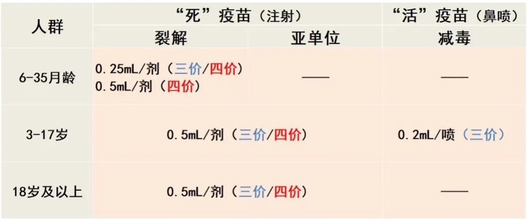 其中,6 月龄至 3 岁的婴幼儿仅可接种 ① 流感灭活(裂解)疫苗;18 岁以上的成年人可以接种 ① 流感灭活(裂解)疫苗和 ② 流感灭活(亚单位)疫苗;而 3~17 岁的儿童和青少年可以接种全部上述三种流感疫苗。