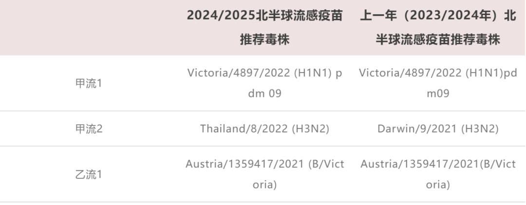 答:世界卫生组织已于 2024 年 2 月公布了今年北半球流感疫苗推荐毒株。与去年相比,仅有甲流的一个成分(H3N2)有所变动: