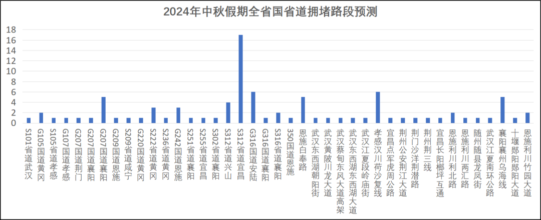 S312省道宜昌段、G316国道安陆段、孝感汉川荷沙复线、G207国道襄阳段、恩施白奉路、襄阳襄州乌海线、S312省道兴山段、S222省道黄冈段、G242国道恩施段等路段拥堵指数较高。